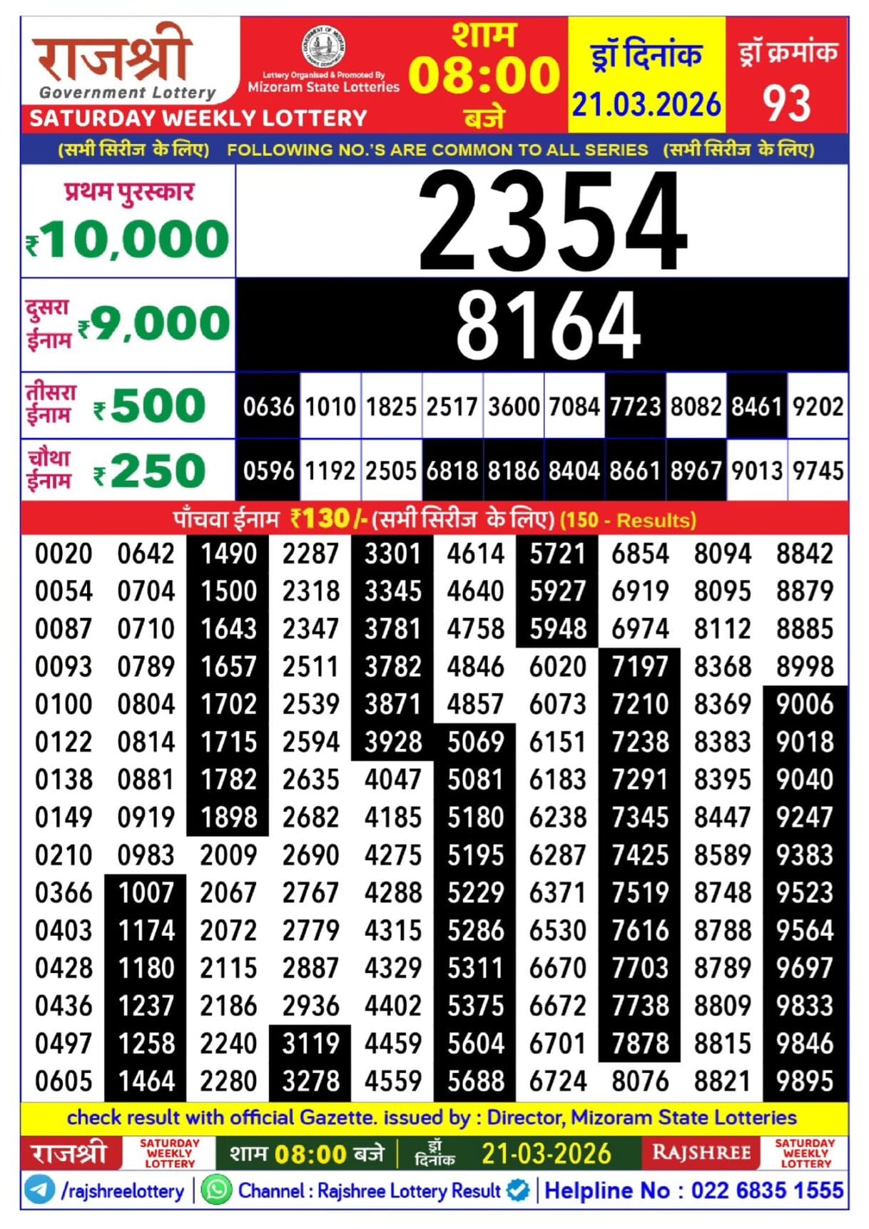 Rajshree Friday Weekly Lottery 20.03.2026 Result 8 PM