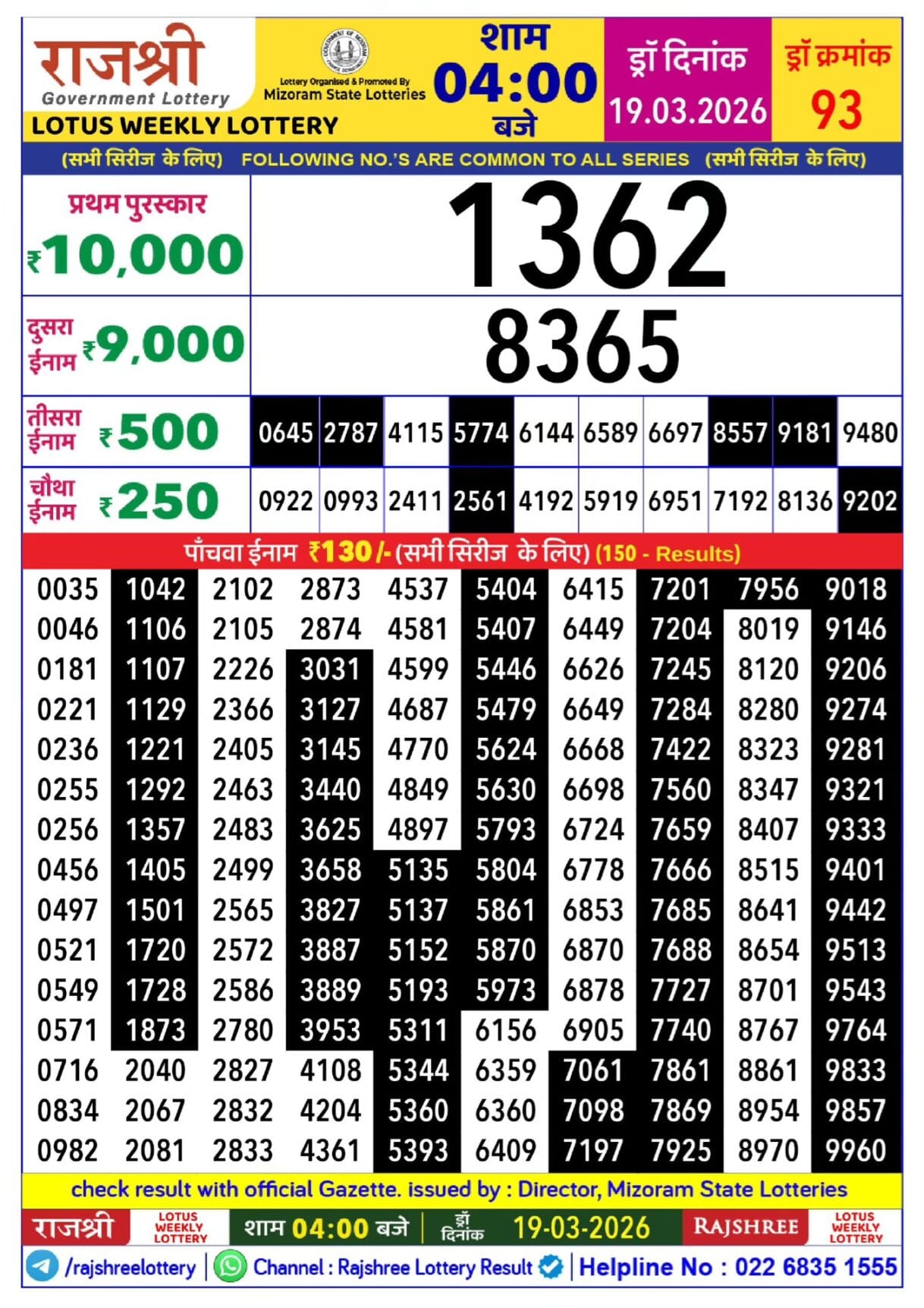 Rajshree Lotus Weekly Lottery 19.03.2026 Result 4 PM
