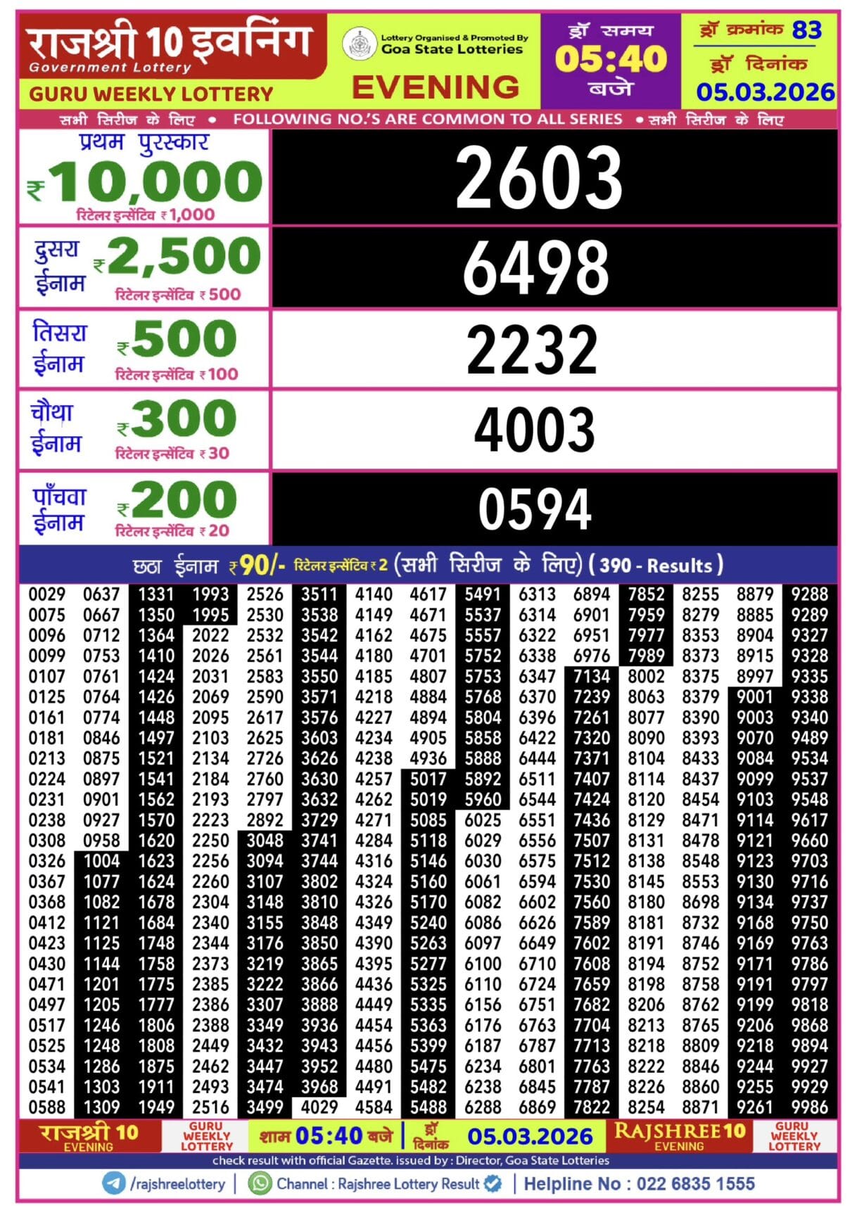 Rajshree 10 Evening Guru Weekly Lottery 05.03.2026 Result 5.40 PM