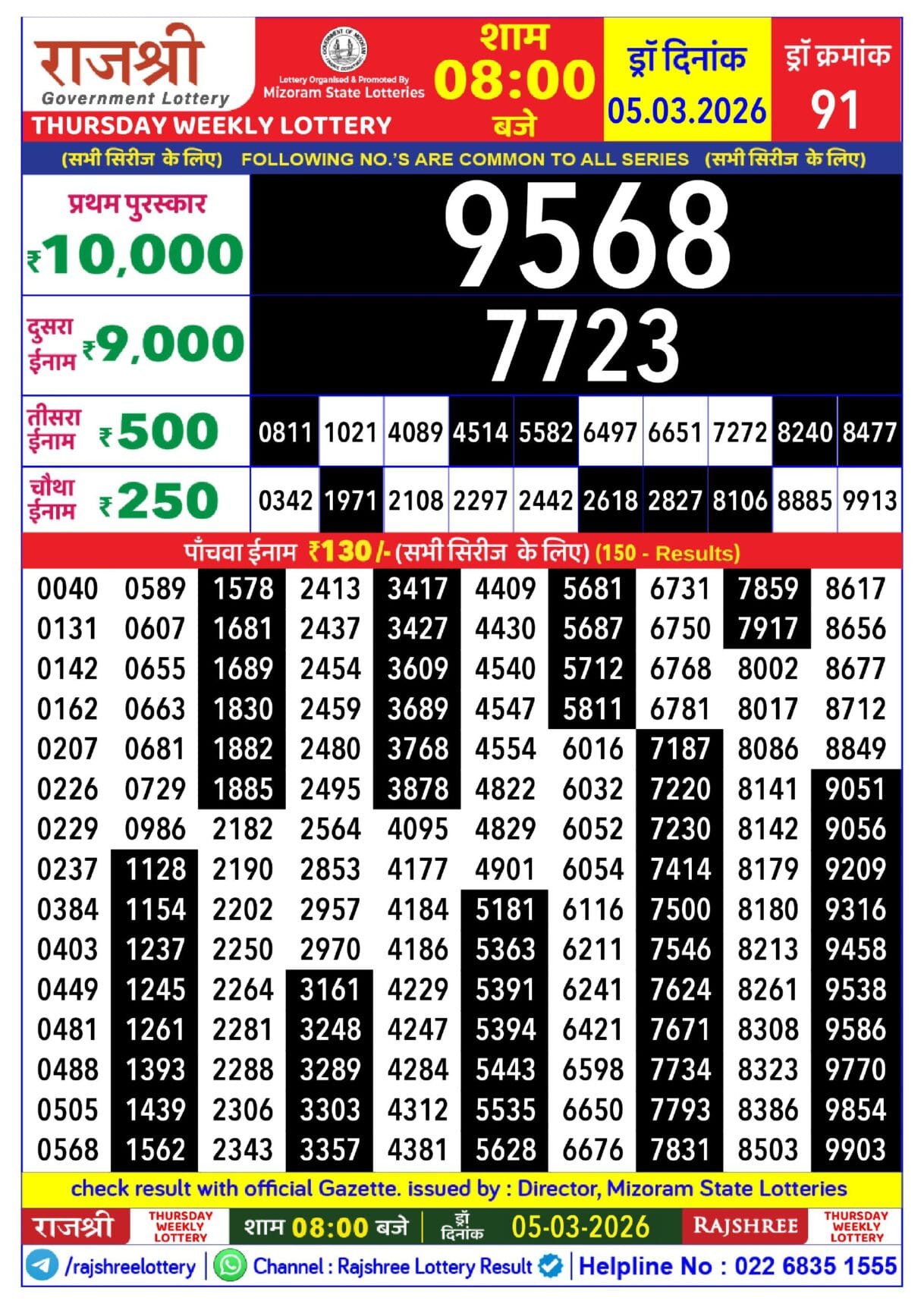 Rajshree Thursday Weekly Lottery 05.03.2026 Result 8 PM