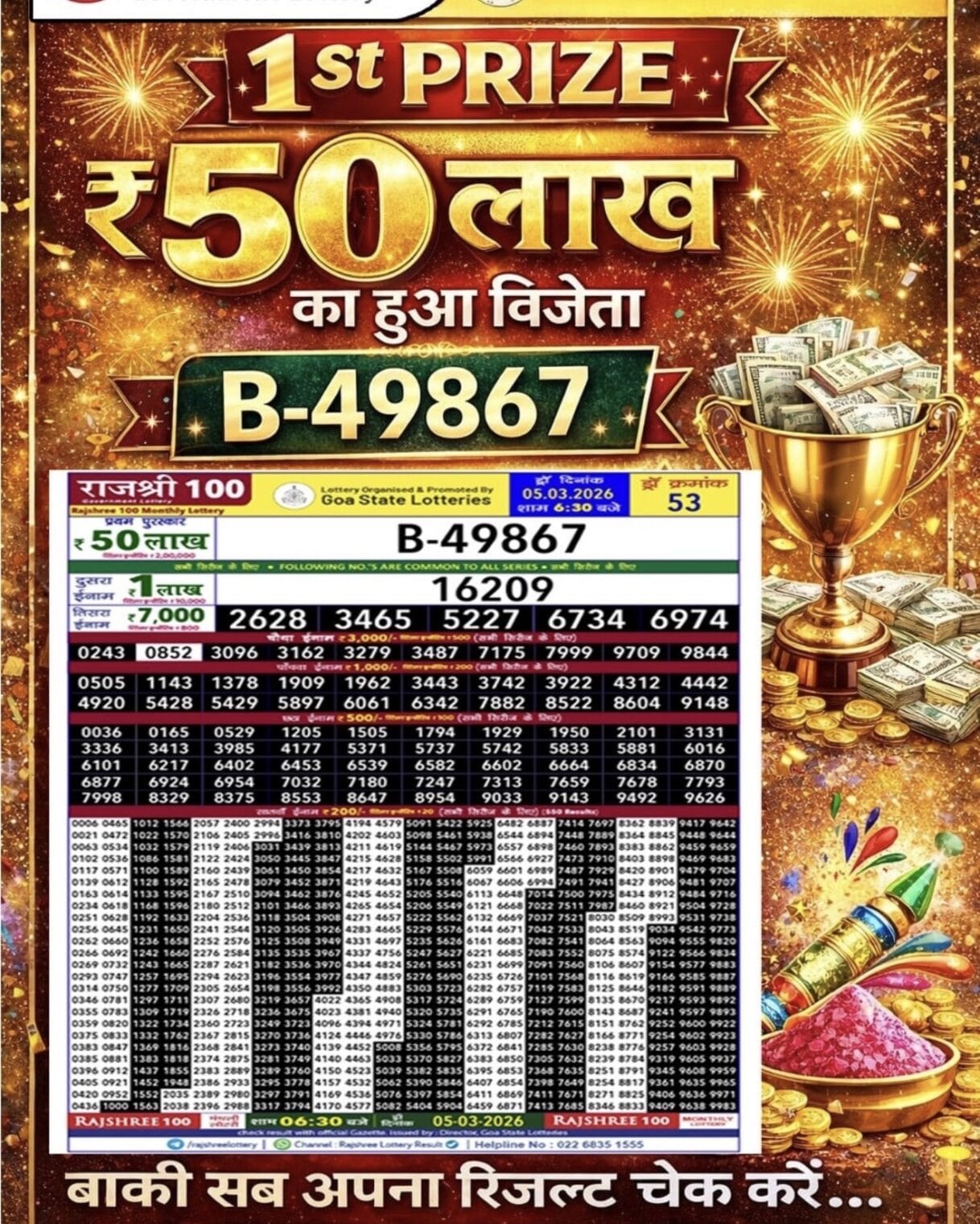 Rajshree 100 Monthly Lottery (Holi Special) 05.03.2026 Result 6.30 PM