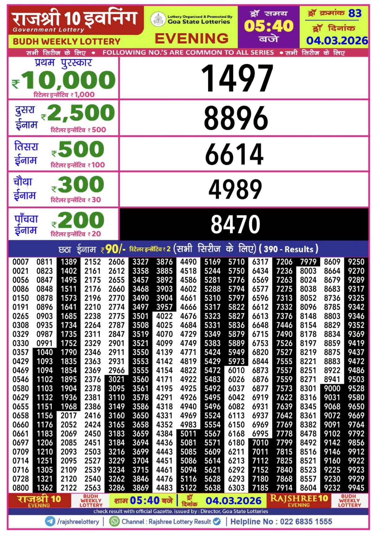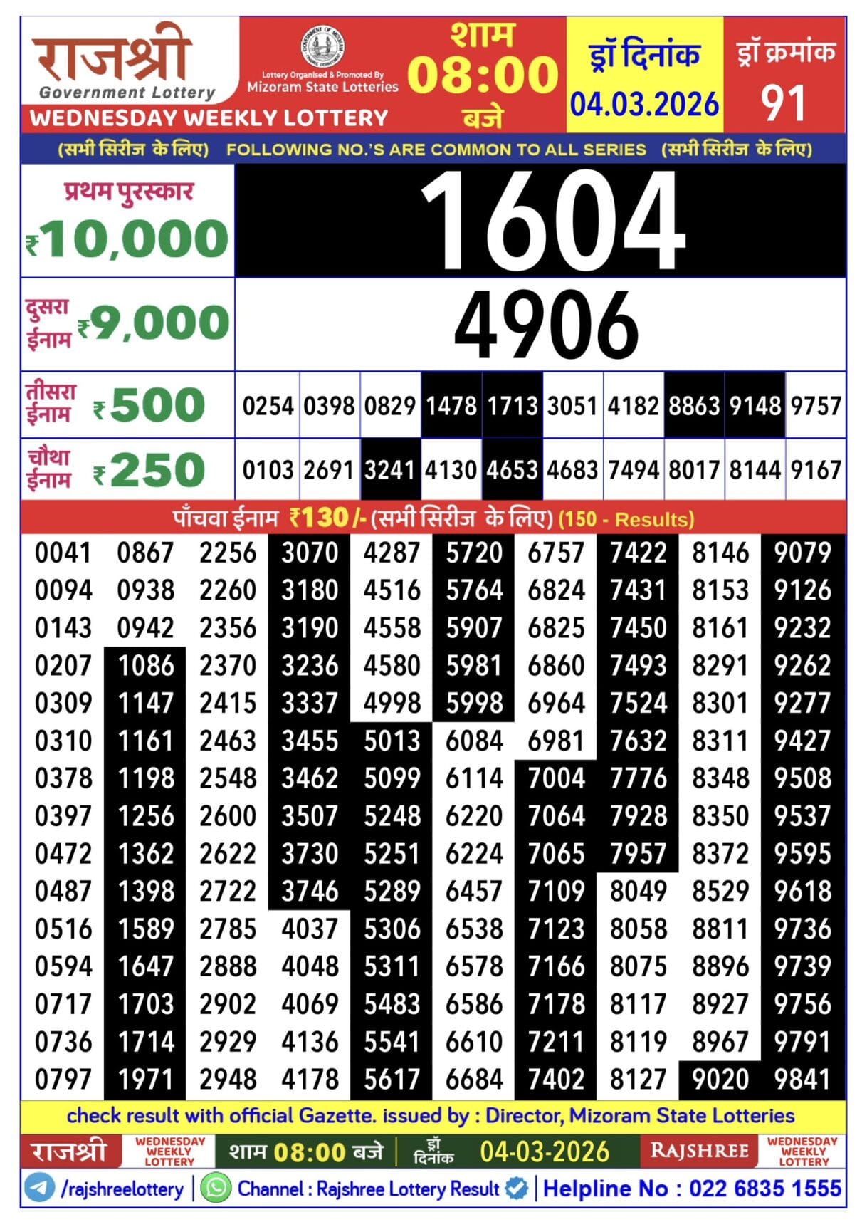 Rajshree Wednesday Weekly Lottery 04.03.2026 Result 8 PM
