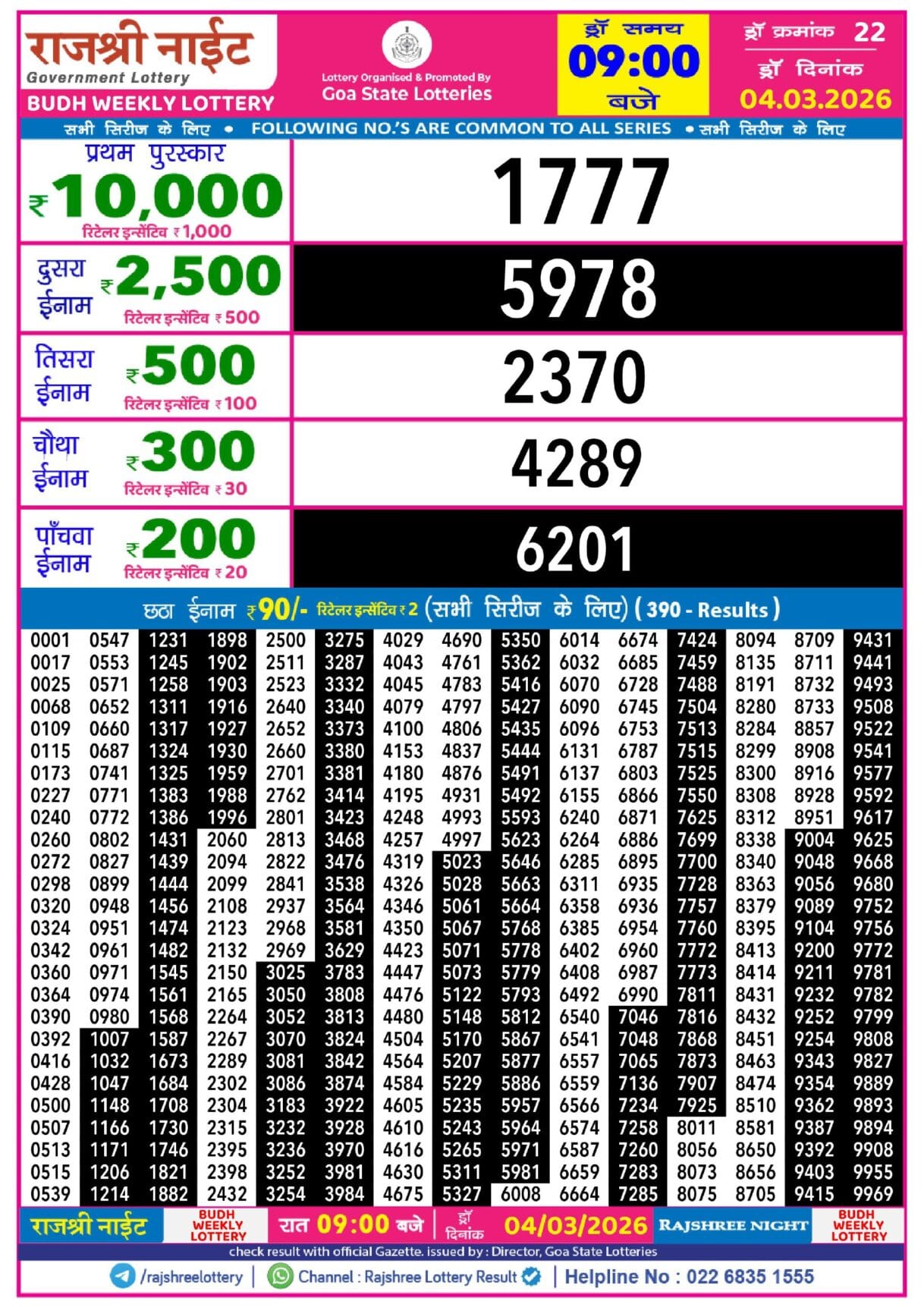 Rajshree Budh Weekly Lottery 04.03.2026 Result 2.25 PM