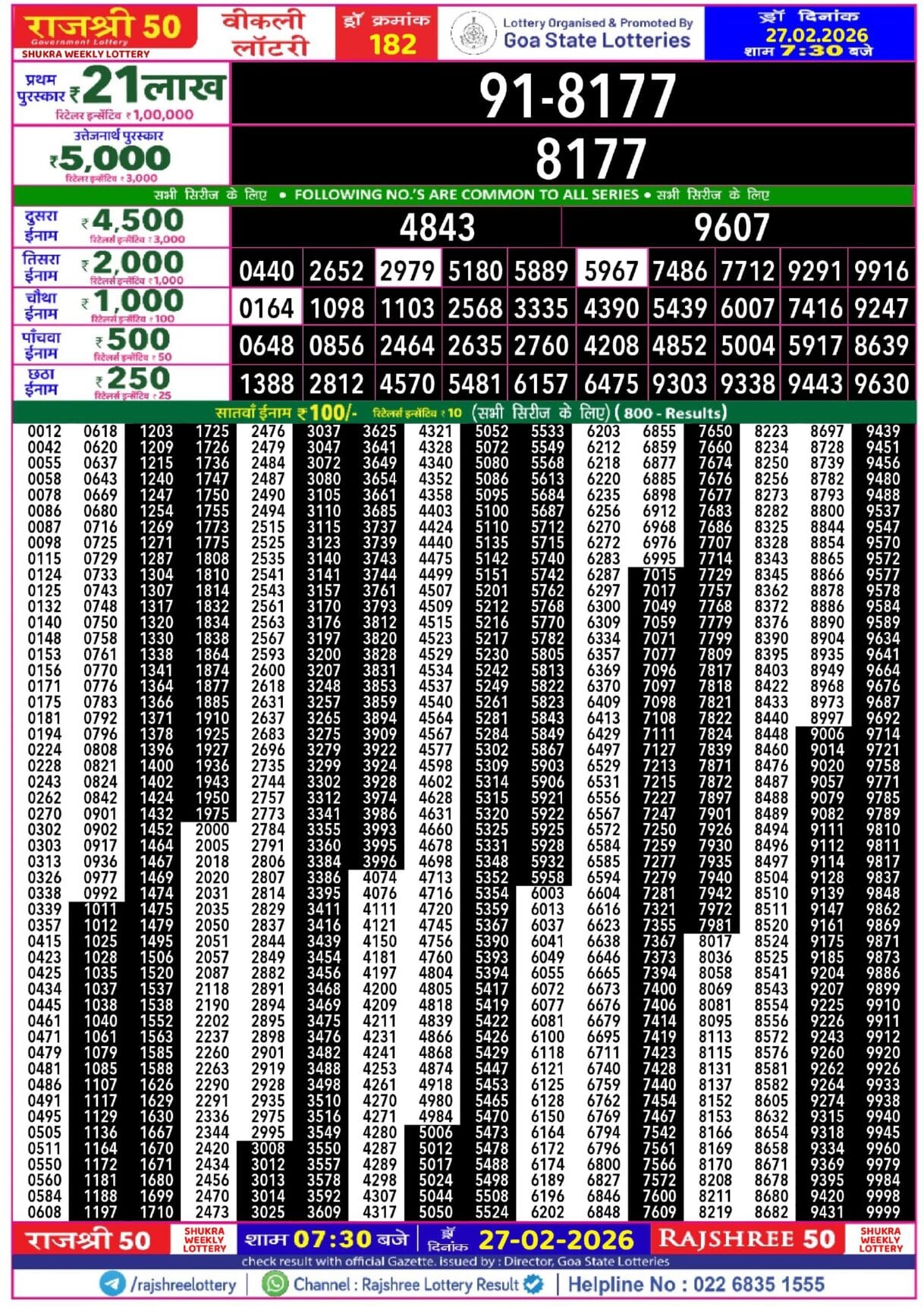 Rajshree 50 Shukra Weekly Lottery 27.2.2026 Result 7.30 PM