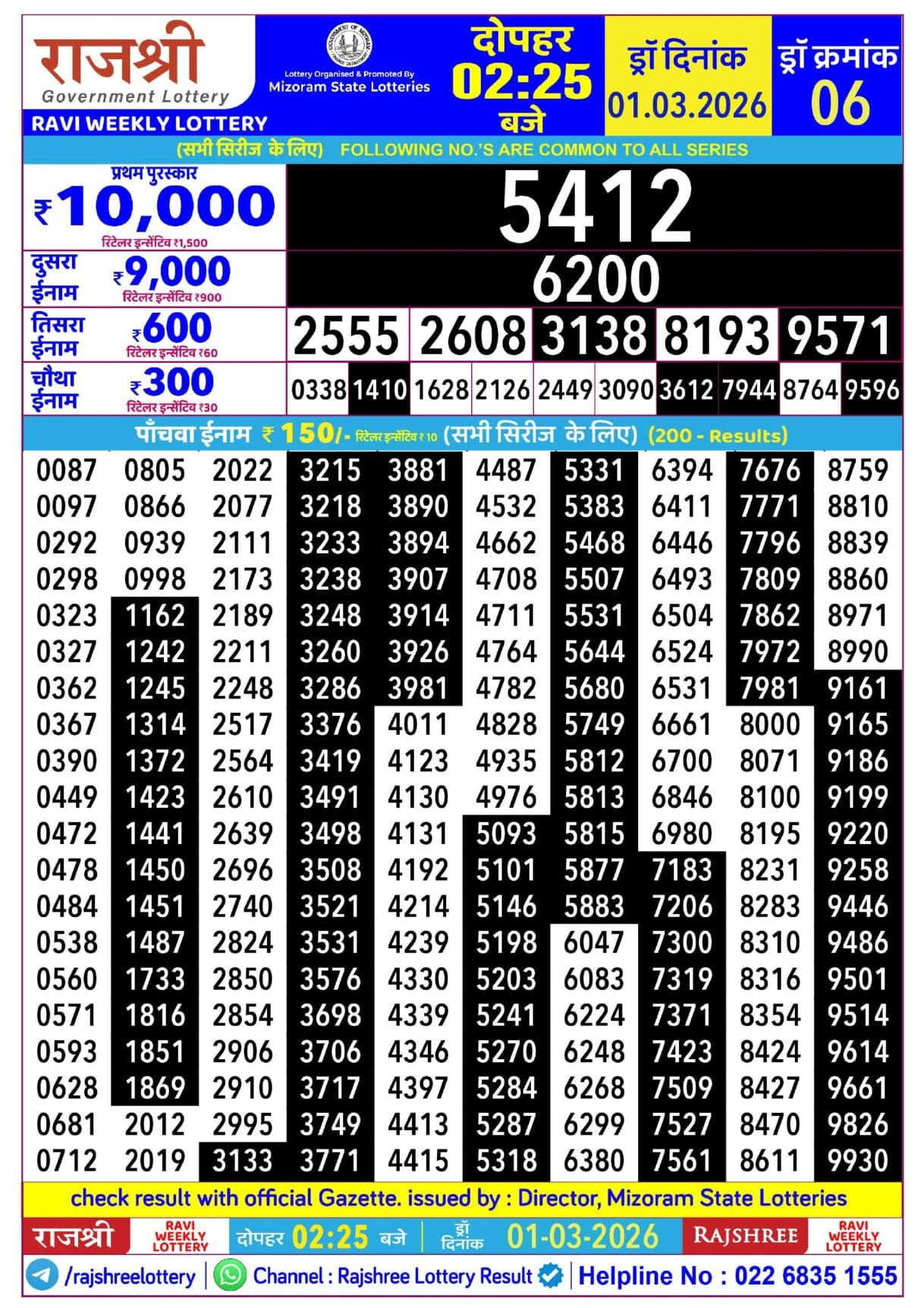 Rajshree Ravi Weekly Lottery 01.03.2026 Result 2.25 PM