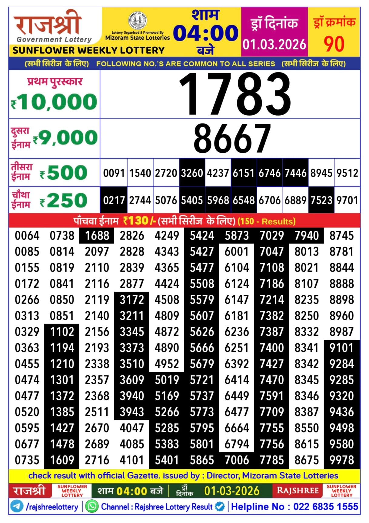 Rajshree Sunflower Weekly Lottery 01.03.2026 Result 4 PM