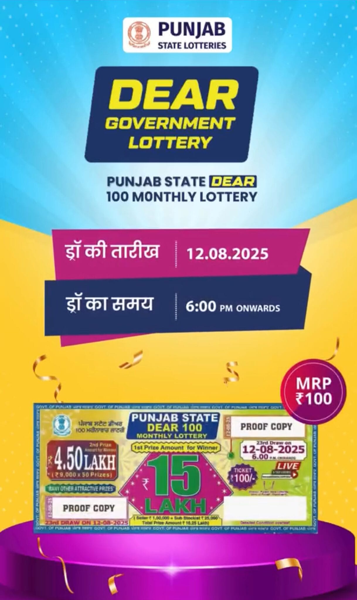 Punjab state dear 100 monthly lottery 12 August 2025 At 6 PM