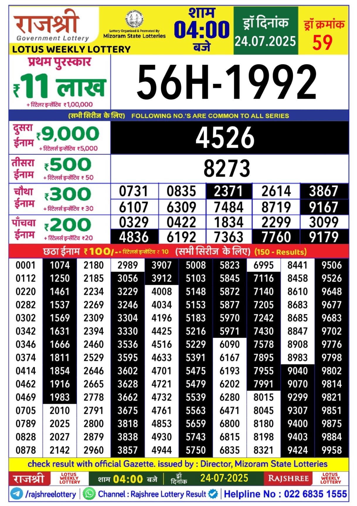 Rajshree Lotus Thursday Weekly Lottery 4PM Result 24.07.2025