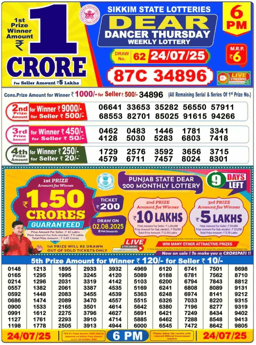 Punjab state dear 10 6pm lottery result 24.07.2025