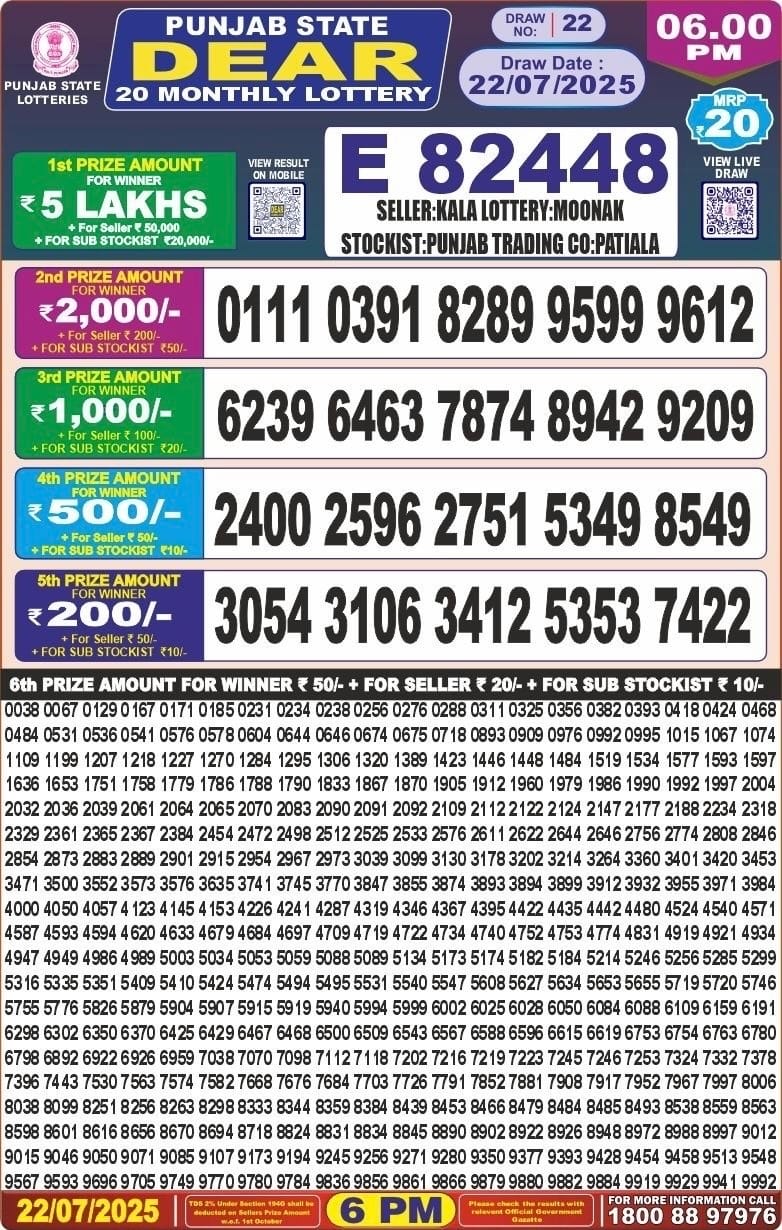 Punjab state dear 20 monthly lottery 22.07.2025 result 6pm
