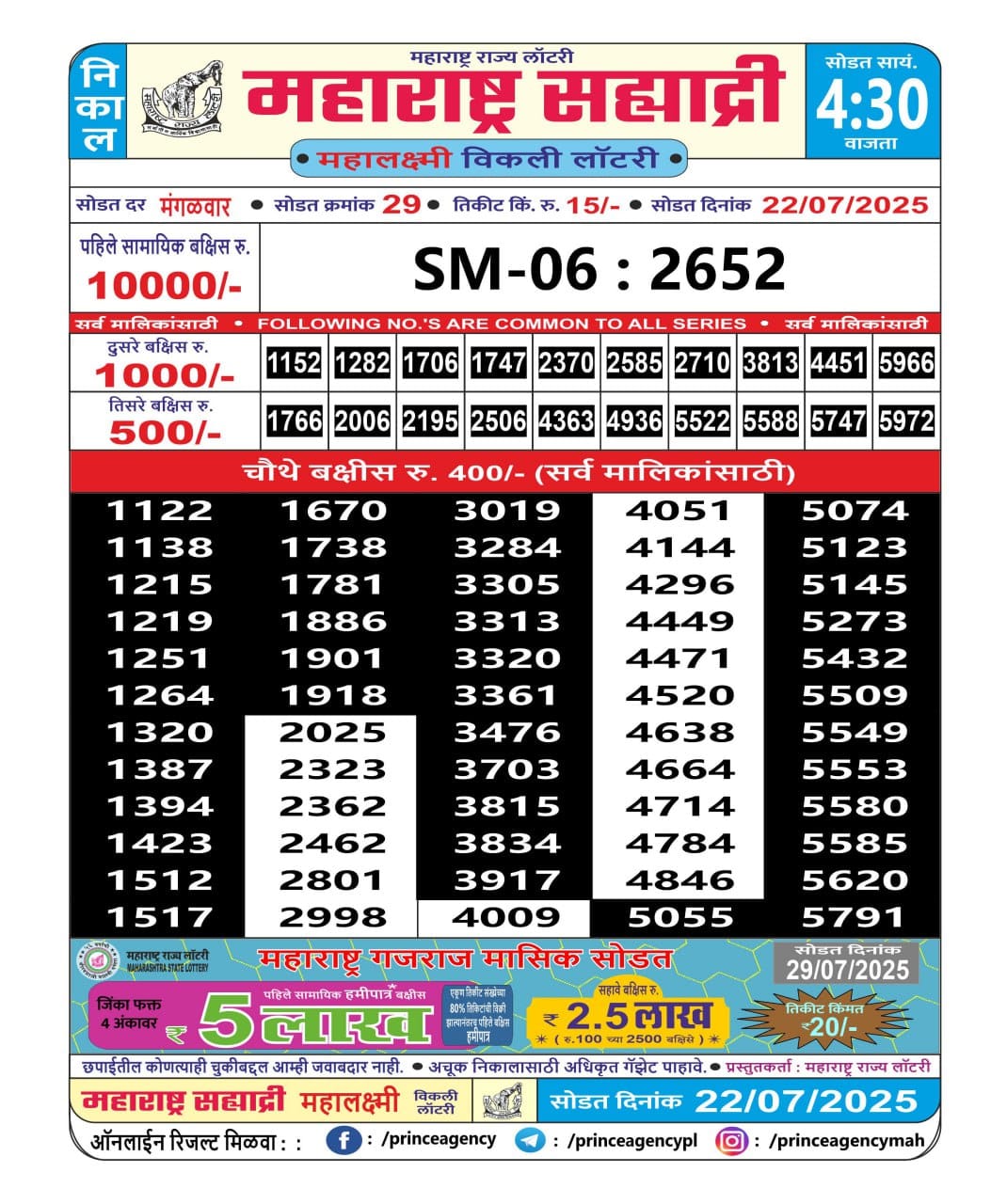 Maharashtra Sahyadri Mahalaxmi Weekly Draw 22.07.2025 Result 4.30pm