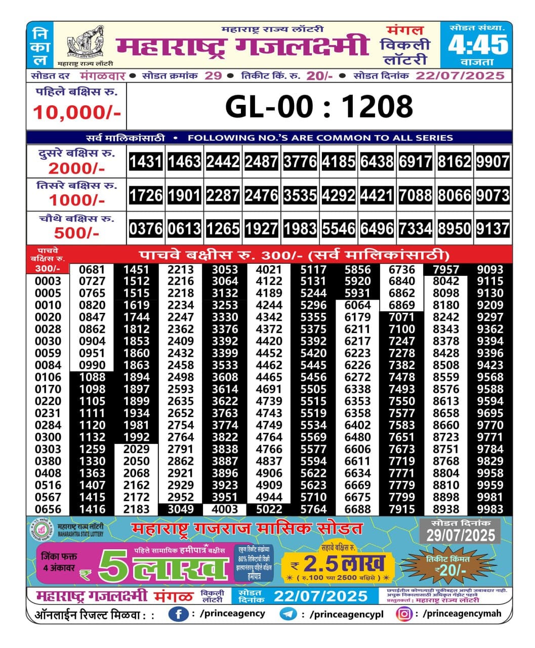 Maharashtra Gajlaxmi Mangal Weekly Draw 22.07.2025 Result 4.45pm