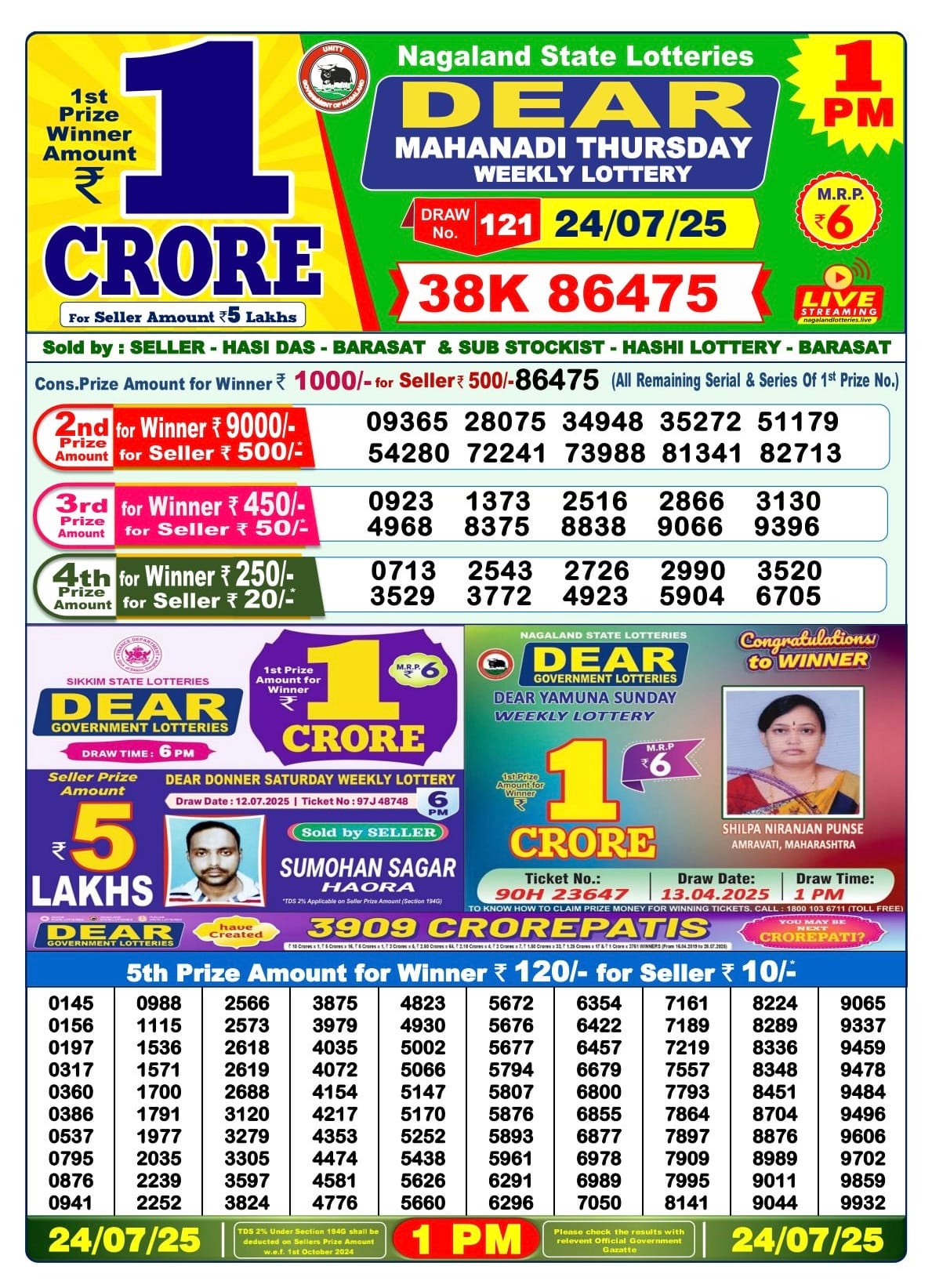 Dear mahanadi Thursday Weekly 1pm result 24.07.2025