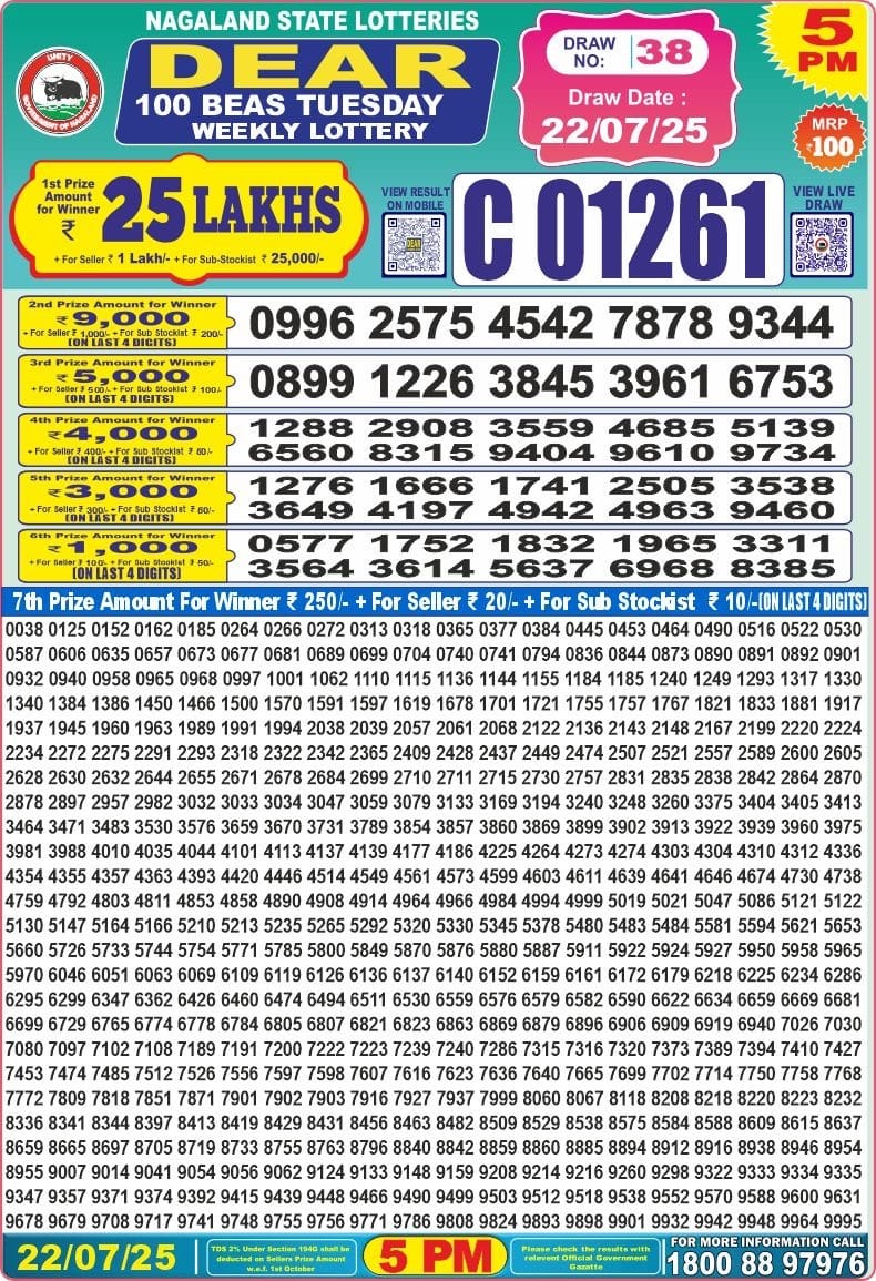 Dear 100 beas tuesday Lottery 5pm Result 22.07.2025