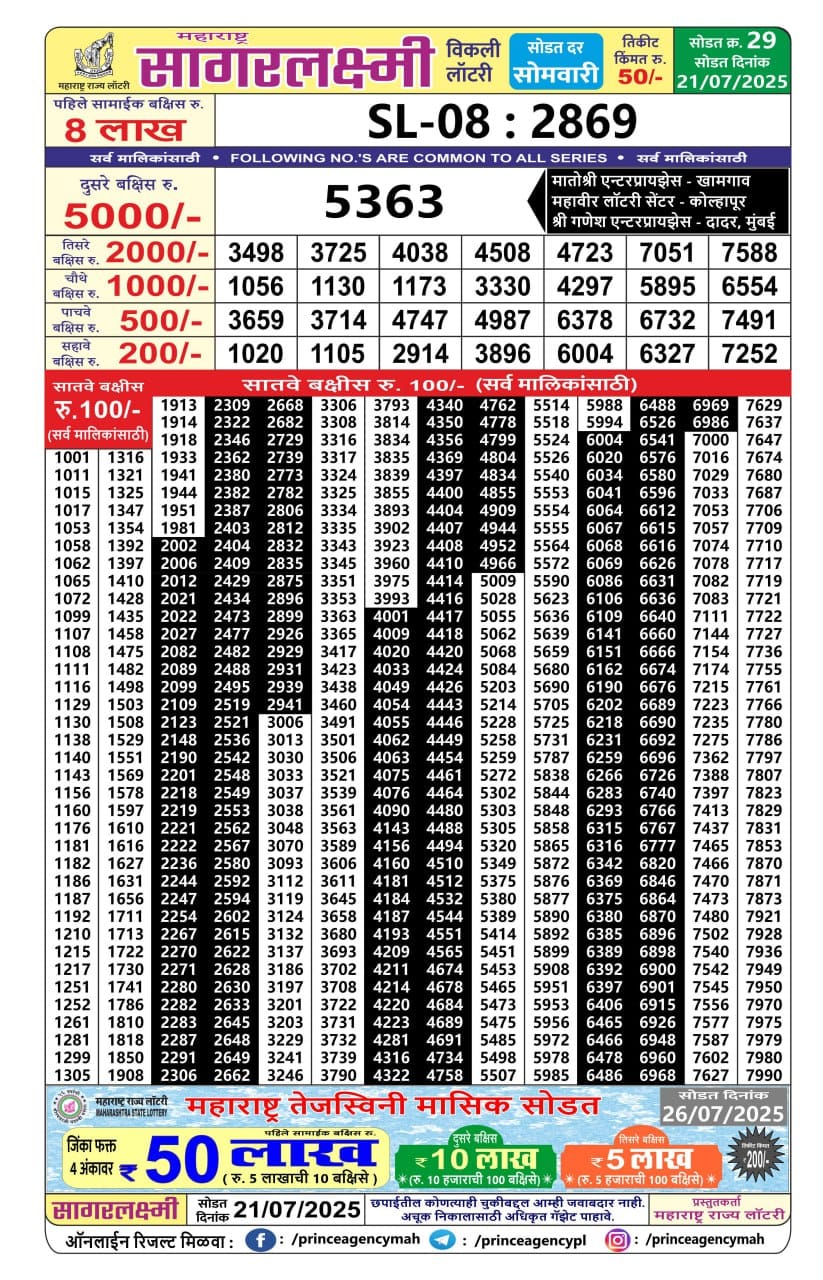 Maharashtra Sagarlaxmi Weekly Draw Result 21.07.2025