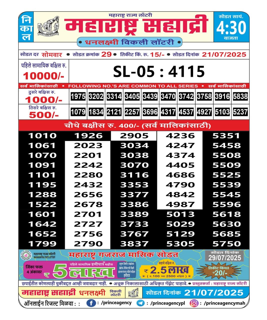 Maharashtra Sahyadri Dhanlaxmi Weekly Draw 21.07.2025 Result 4.30pm