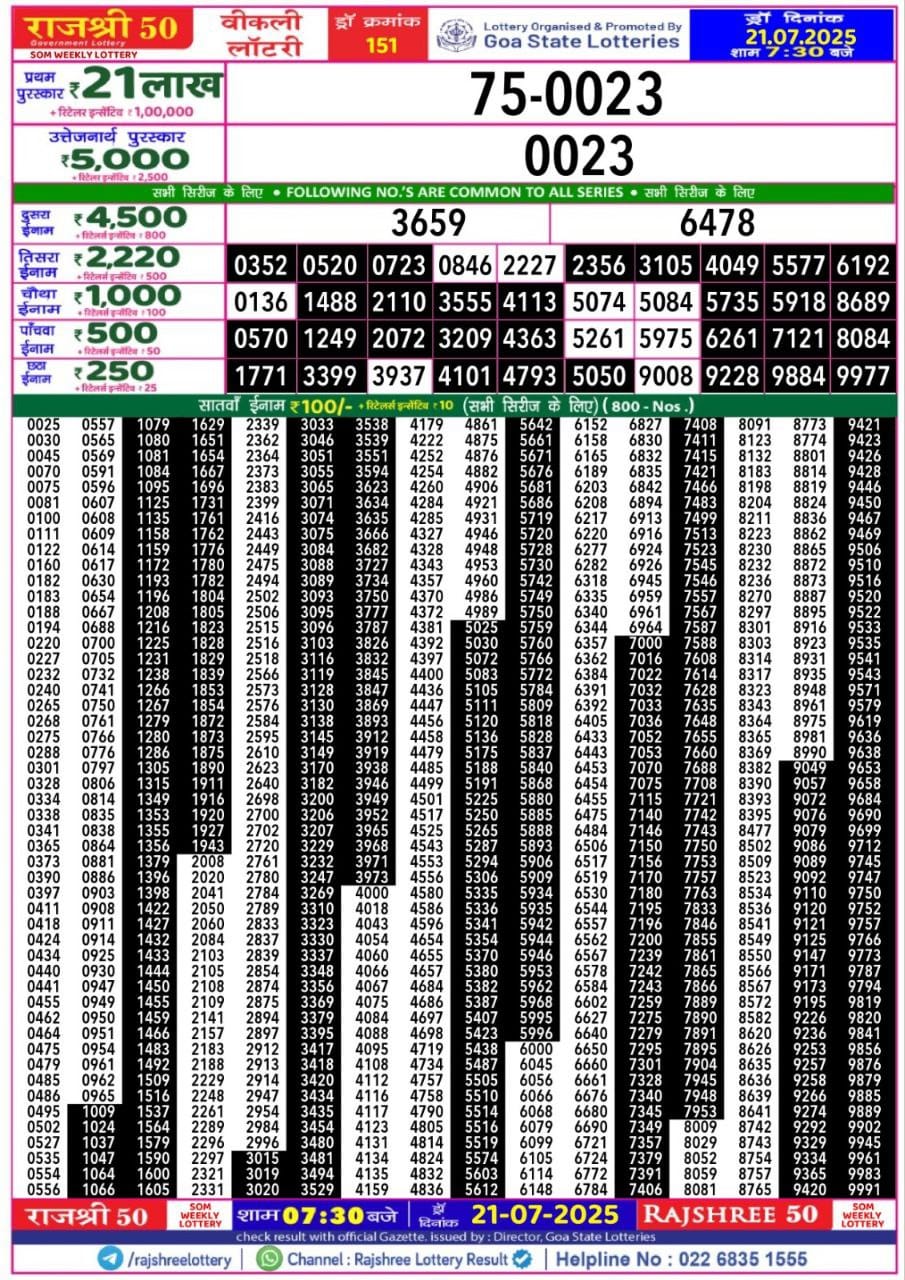 Rajshree 50 Lottery 7:30PM Result 21.07.2025