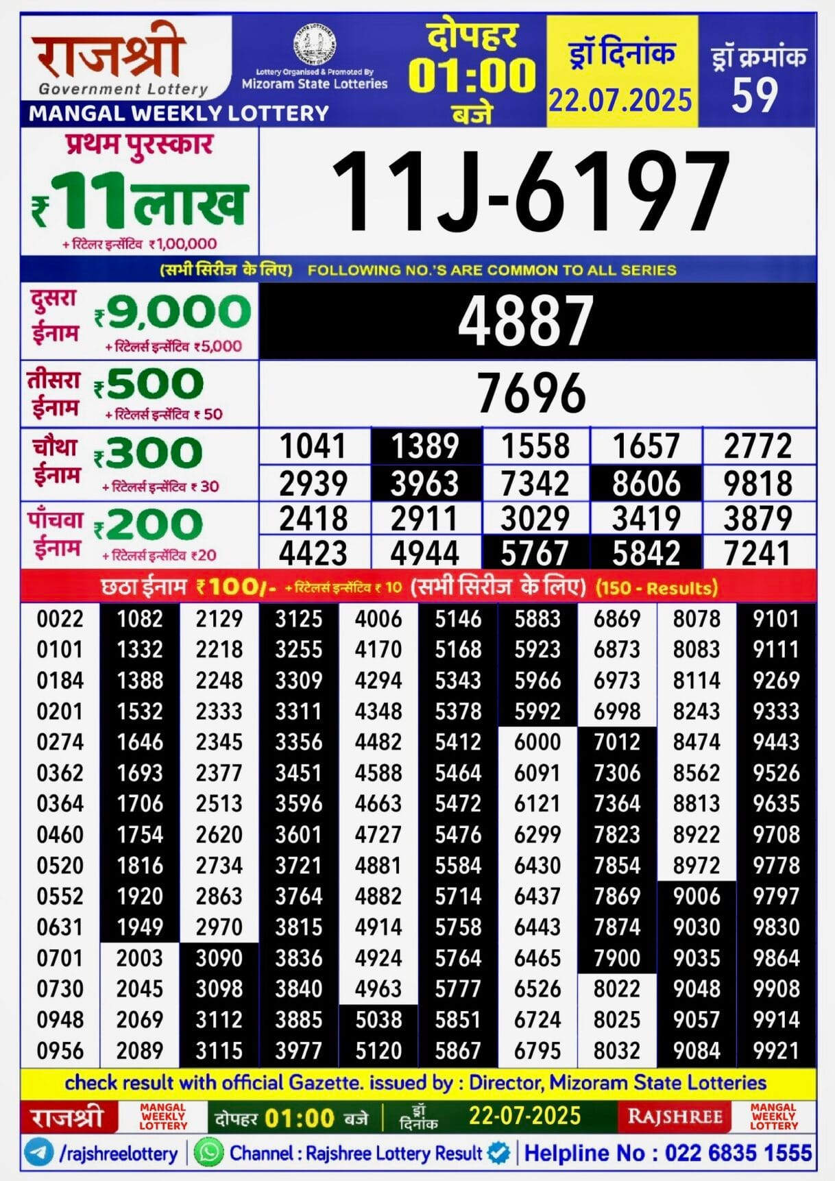 Rajshree mangal Weekly Lottery 1PM Result 22.07.2025