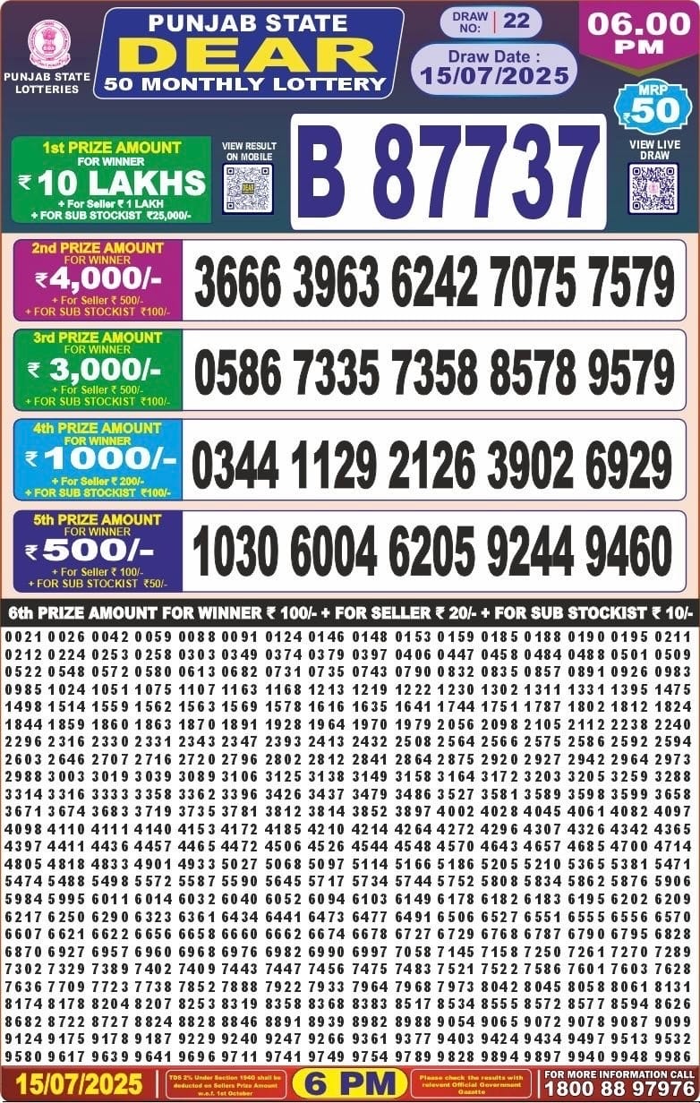 Punjab state dear 50 monthly lottery 15-07-2025 at 6pm