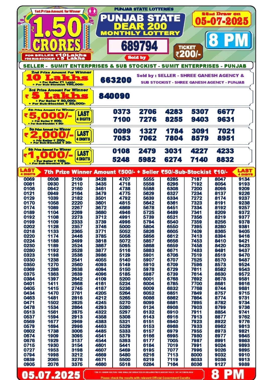 Punjab State 200 Monthly Lottery Result 05.07.2025