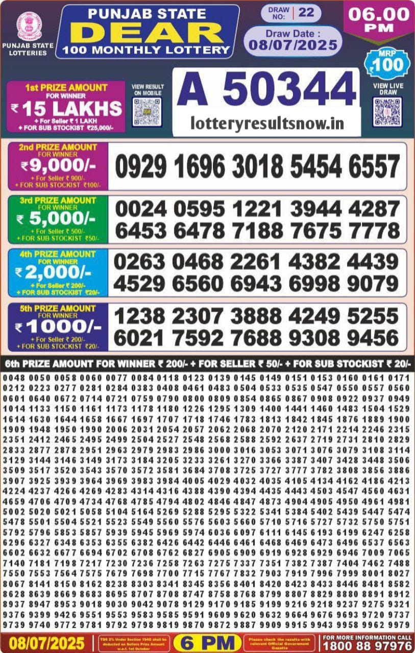 Punjab state dear 100 monthly lottery 8 July 2025 At 6 PM