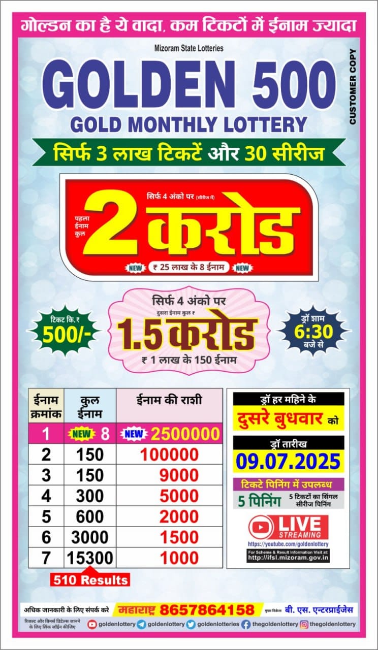 Mizoram state golden 500 gold monthly lottery 9 July 2025 at 6.30pm