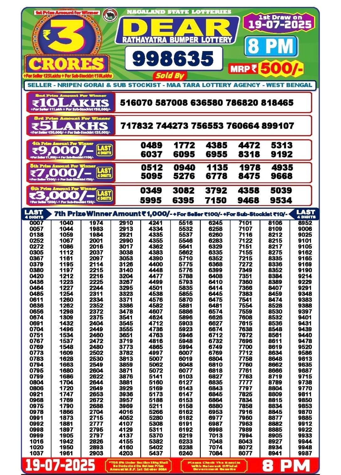 Nagaland State Dear Rathyatra Lottery 19 July 2025 Result 8 PM