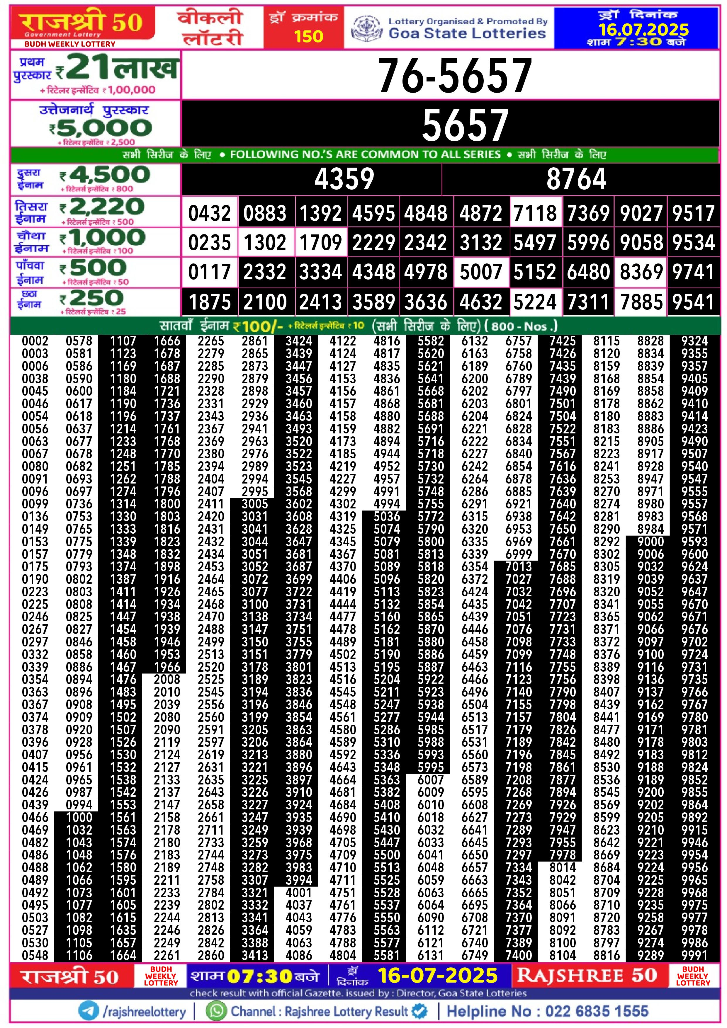 Rajshree 50 Lottery 7:30PM Result 16.07.2025