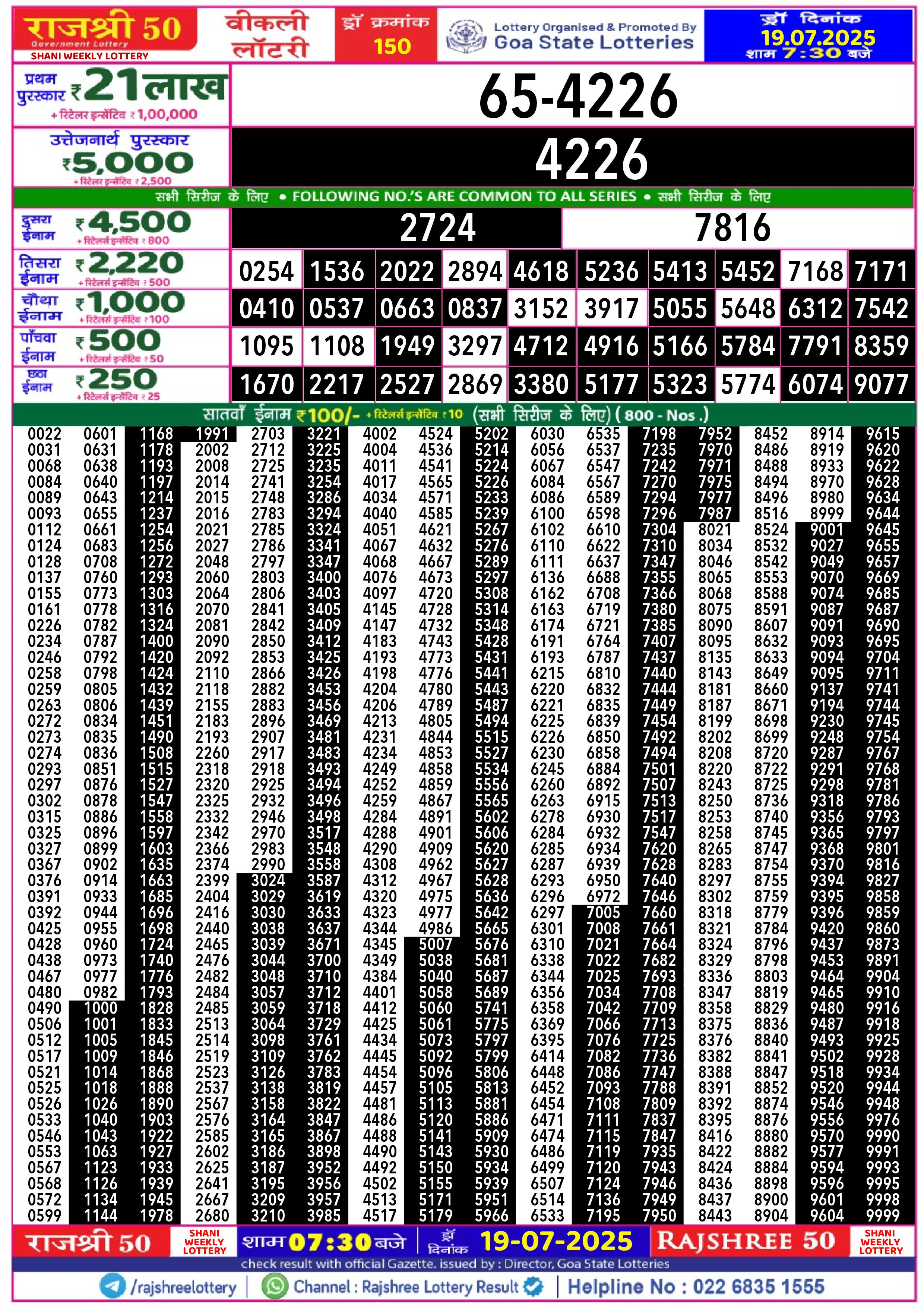 Rajshree 50 Lottery 7:30PM Daily Result 19 July 2025