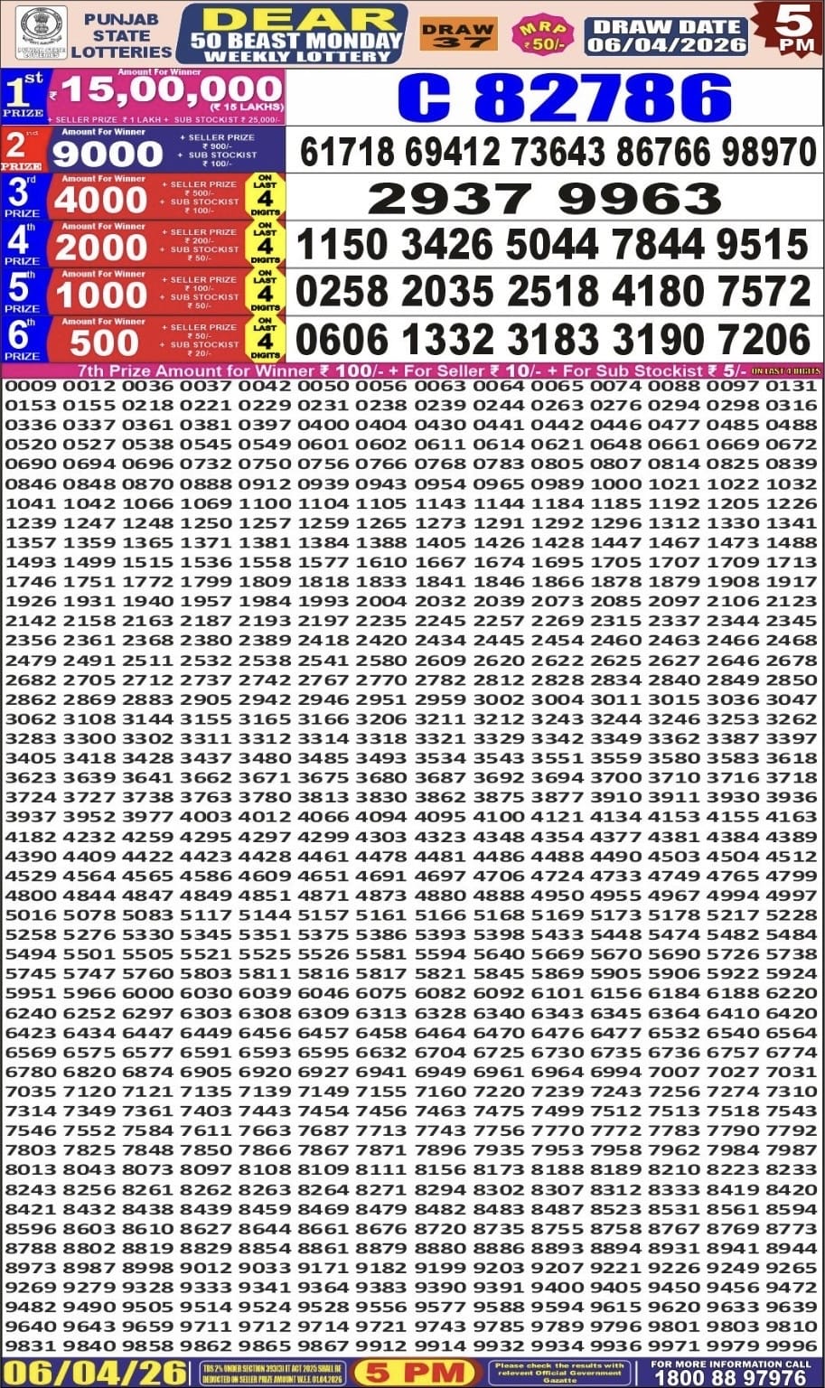 Punjab State Dear 50 Beast Monday Weekly Lottery 06.04.2026 Result 5 PM