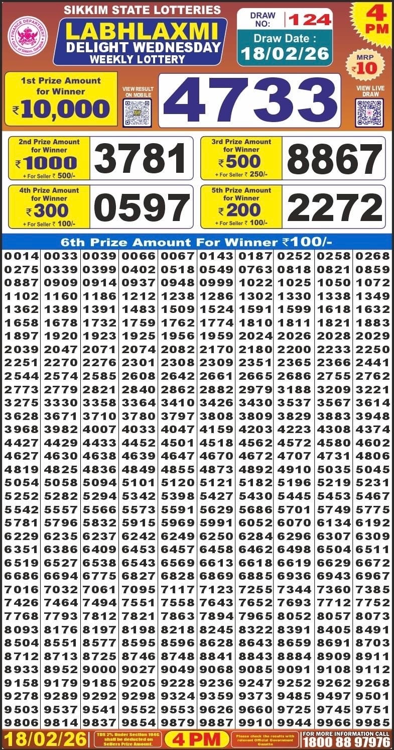 Sikkim State Labhlaxmi Delight Wednesday Weekly Lottery 18.2.2026 Result 4 PM