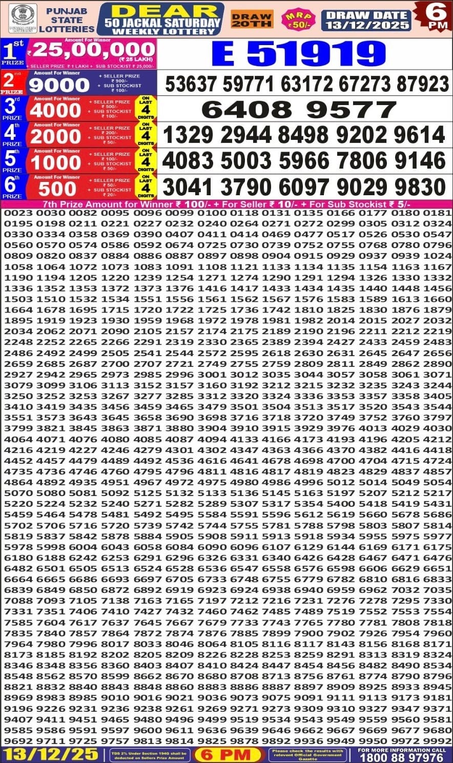 Punjab State Dear 50 Jackal Saturday 6pm Lottery Result 13.12.2025