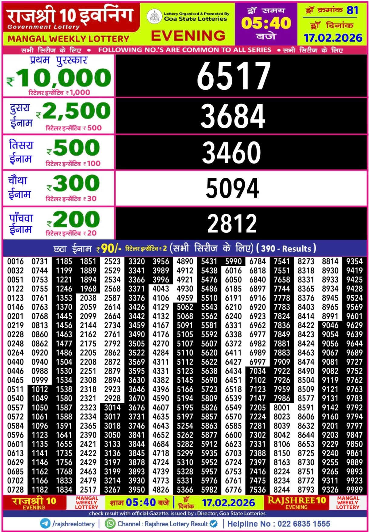 Rajshree 10 Evening Tuesday Weekly Lottery 17.02.2026 Result 5.40 PM