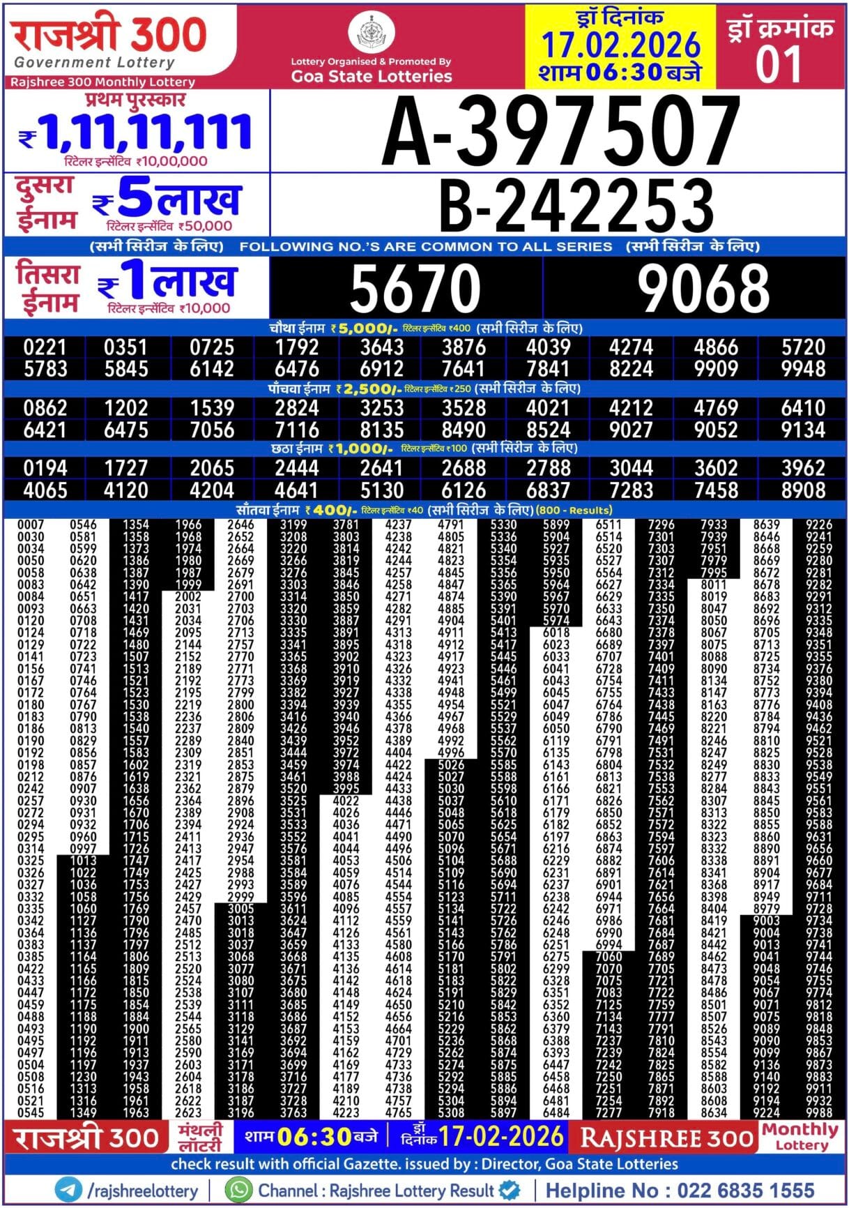 Rajshree 300 Monthly Lottery 17.2.2026 Result 6.30 PM