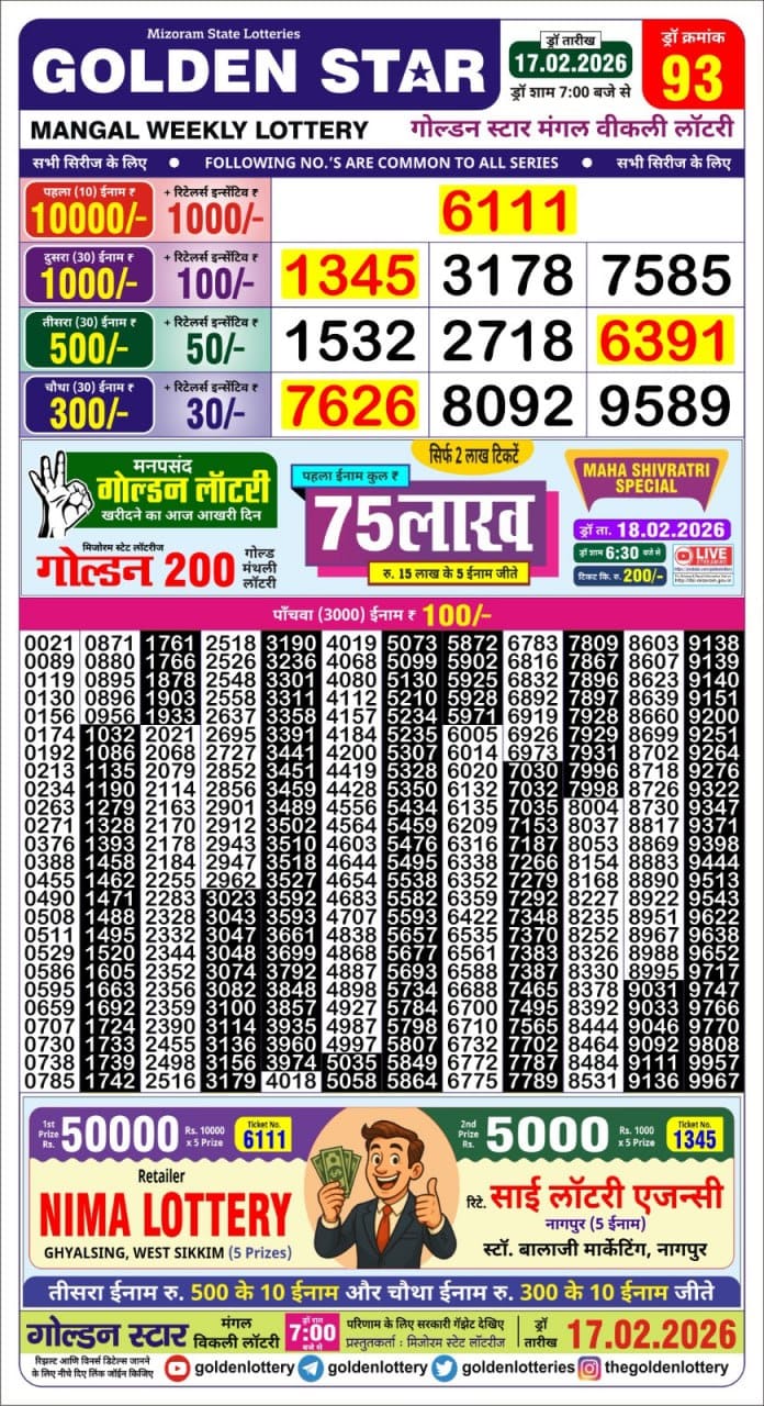 Golden Star Mangal Weekly Lottery 17.02.2026 Result 7 PM