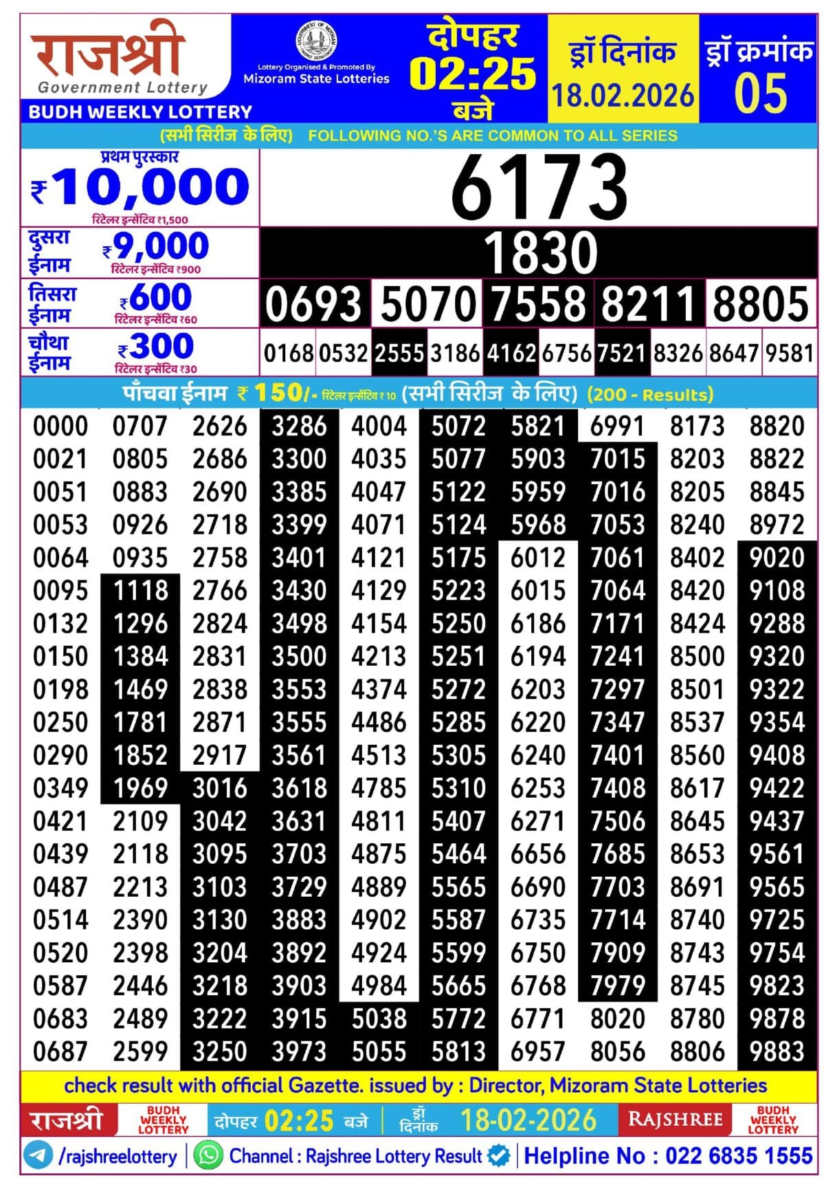 Rajshree Budh Weekly Lottery 18.2.2026 Result 2.25 PM