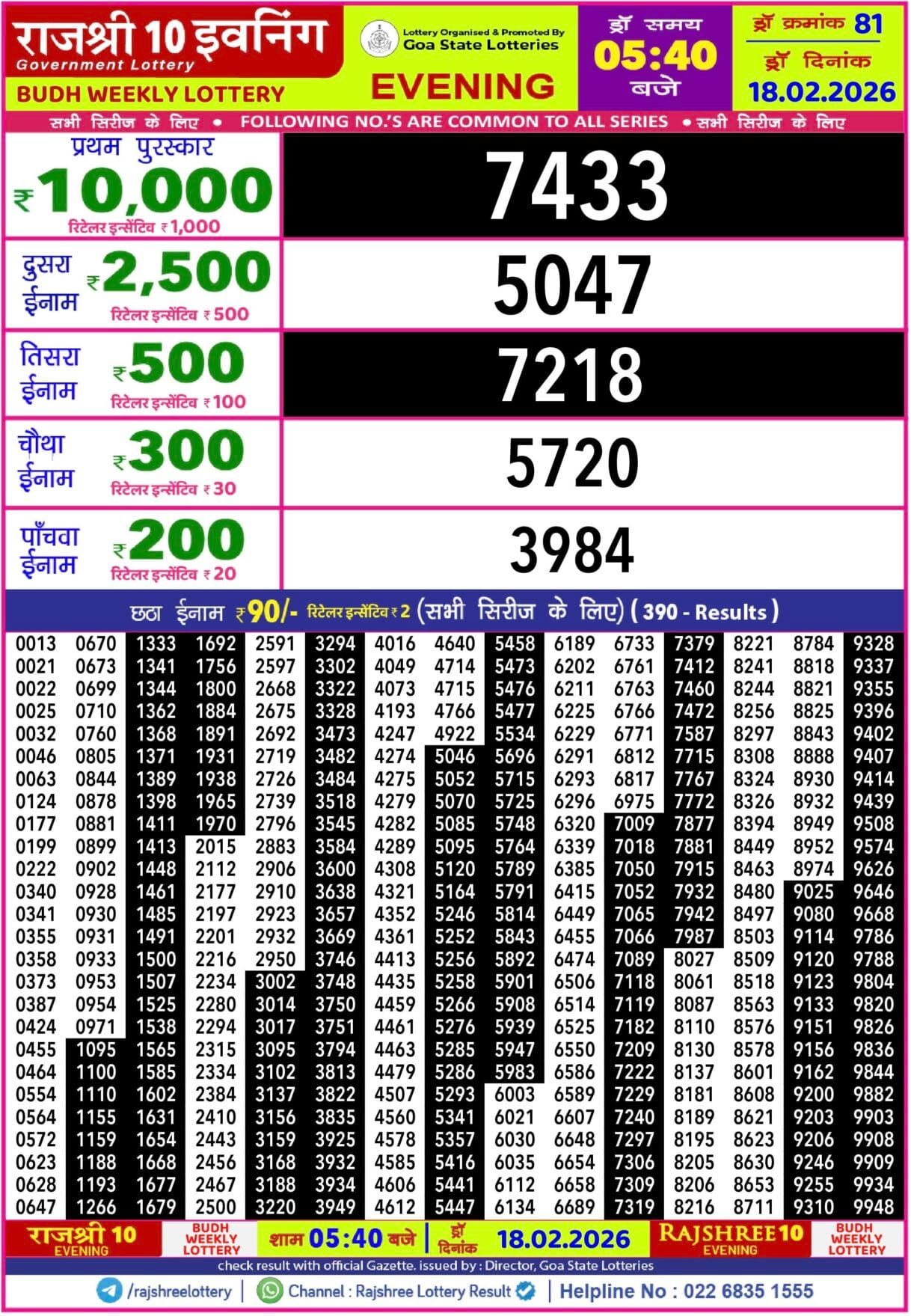Rajshree Wednesday Weekly Lottery 18.2.2026 Result 8 PM