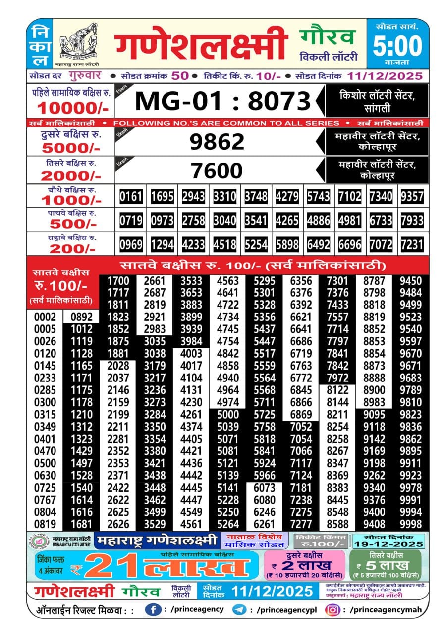 Maharashtra Ganeshlaxmi Gaurav Weekly Draw 11.12.2025 Result 5pm