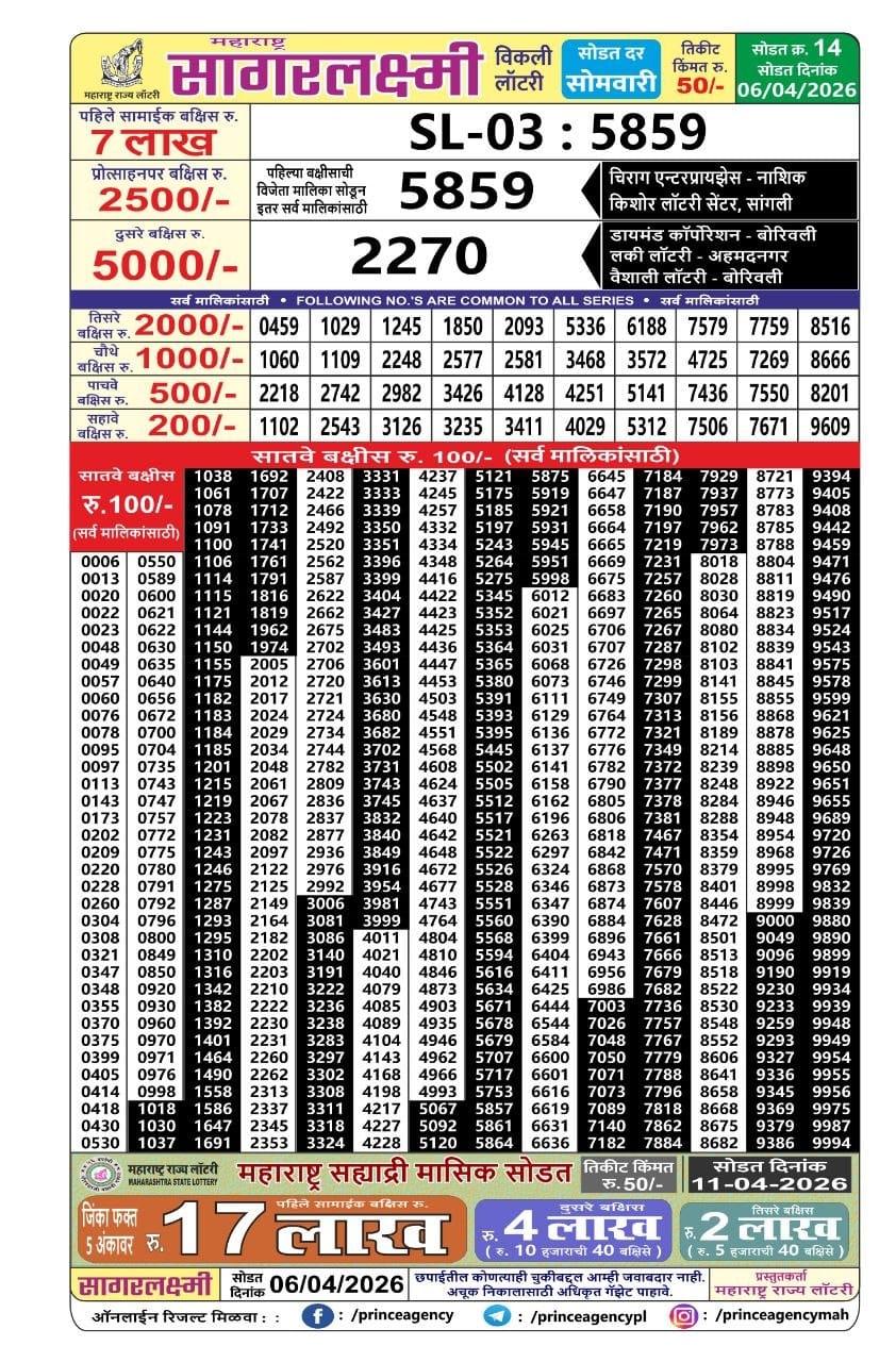 Maharashtra Sagarlaxmi Weekly Draw Result 06.04.2026