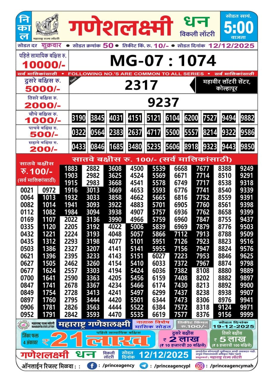Maharashtra Ganeshlaxmi Dhan Weekly Draw 12.12.2025 Result 5pm