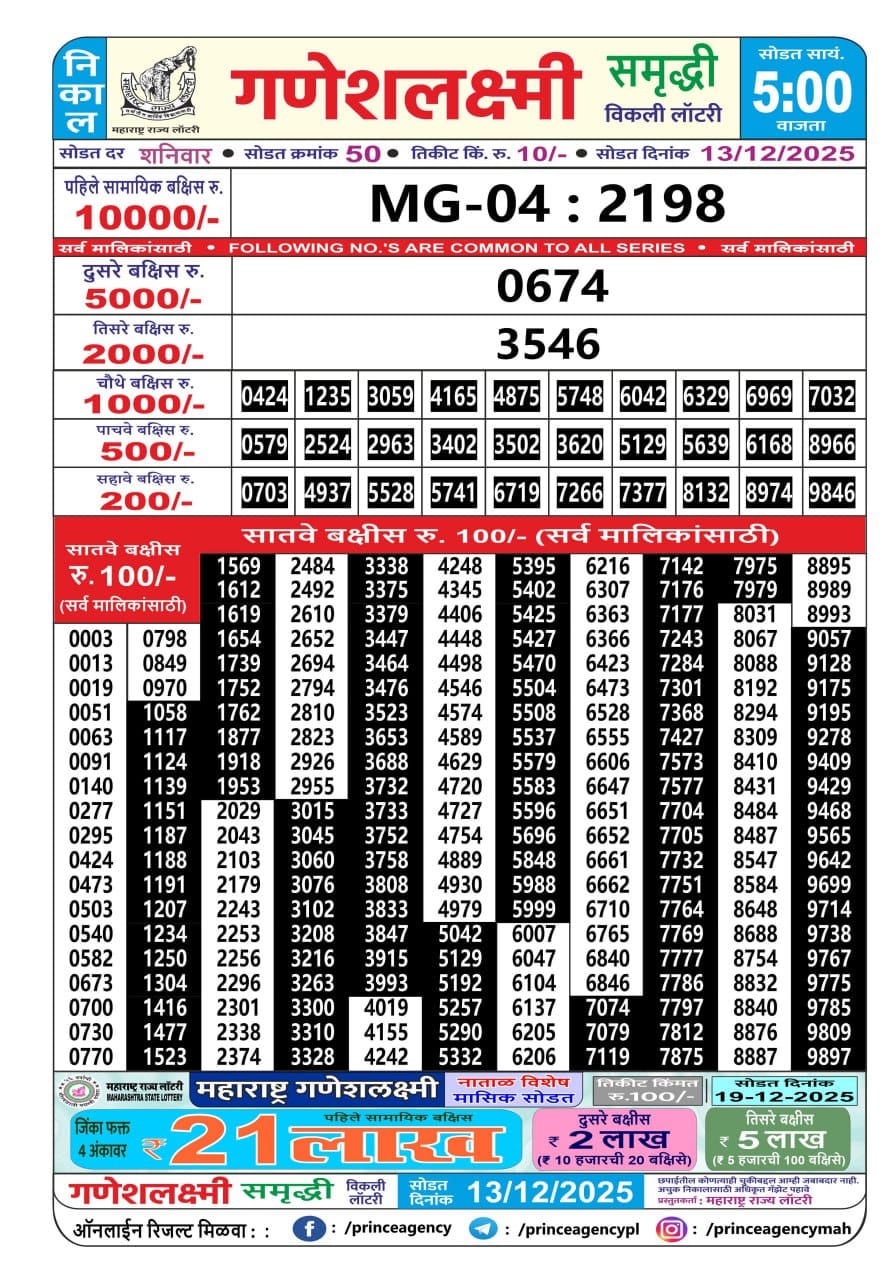 Maharashtra Ganeshlaxmi Samruddhi Weekly Draw 13.12.2025 Result 5pm