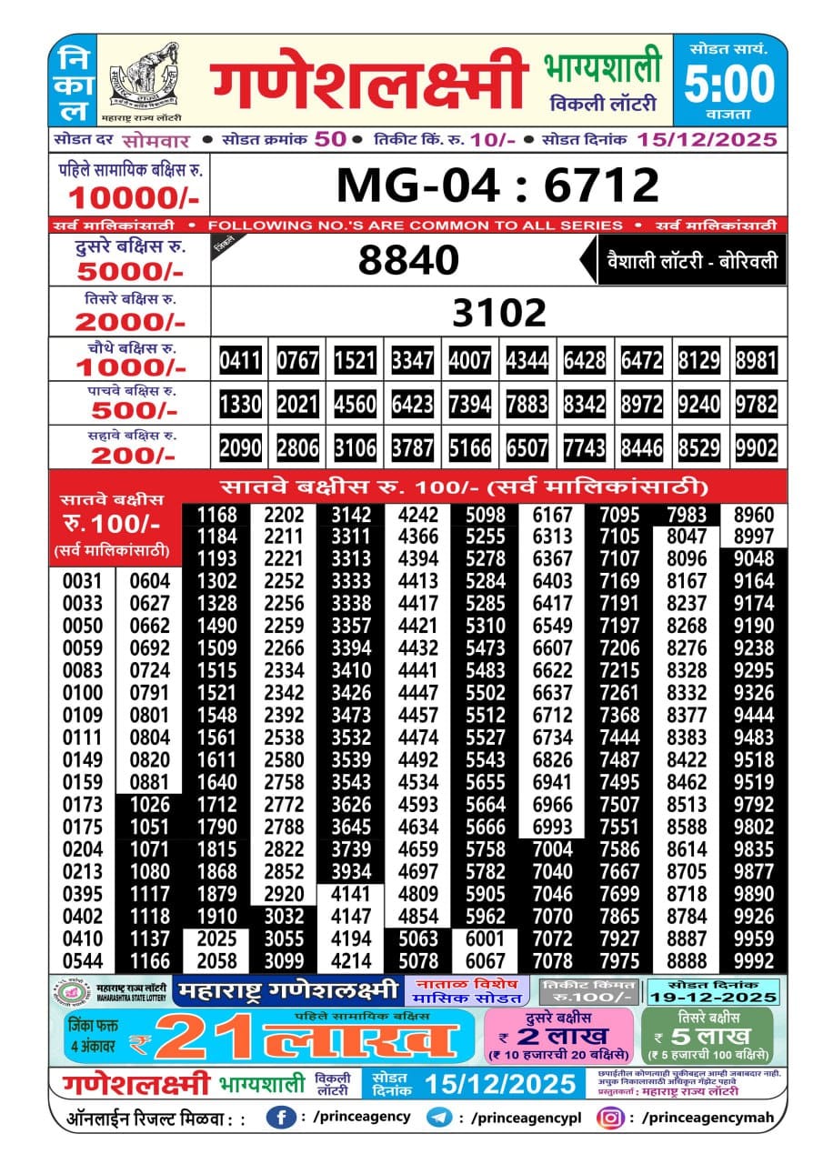 Maharashtra Ganeshlaxmi Bhagyashali Weekly Draw 15.12.2025 Result 5pm