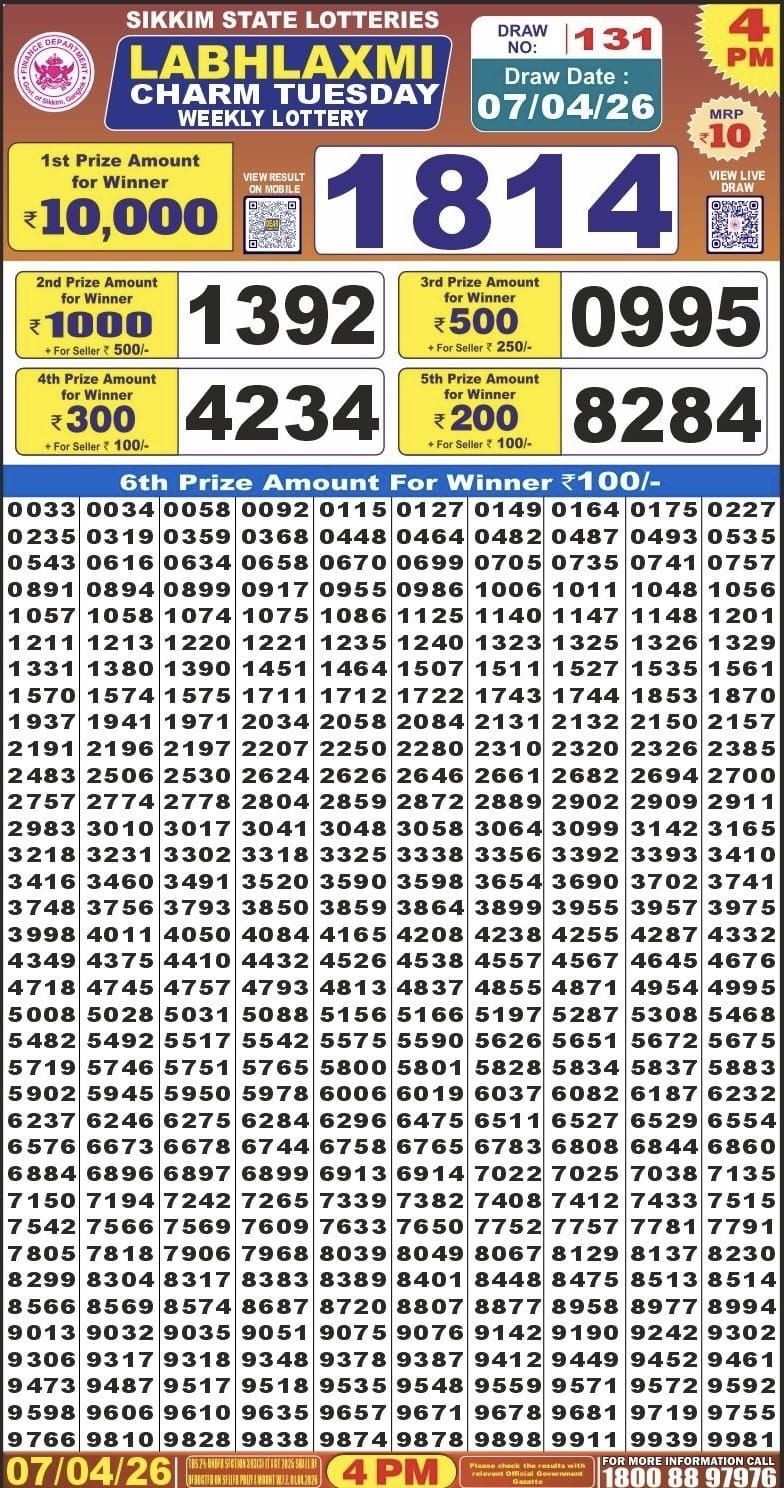 Sikkim State Labhlaxmi Charm Tuesday Weekly Lottery 07.04.2026 Result 4 PM