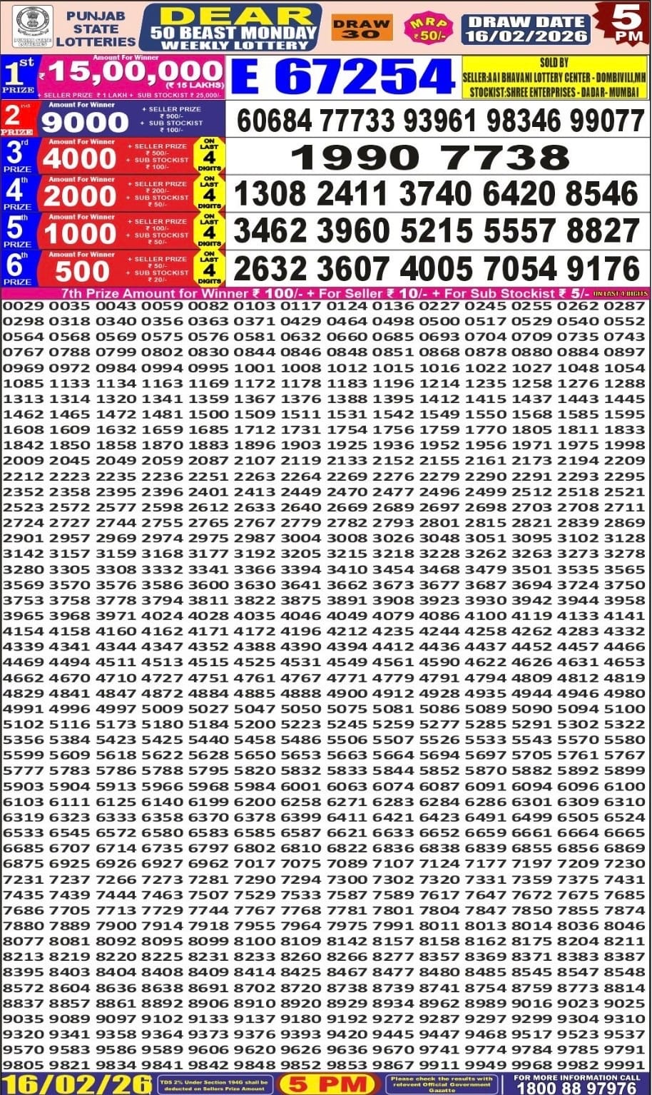 Punjab State Dear 50 Beast Monday Weekly Lottery 16.2.2026 Result 5 PM