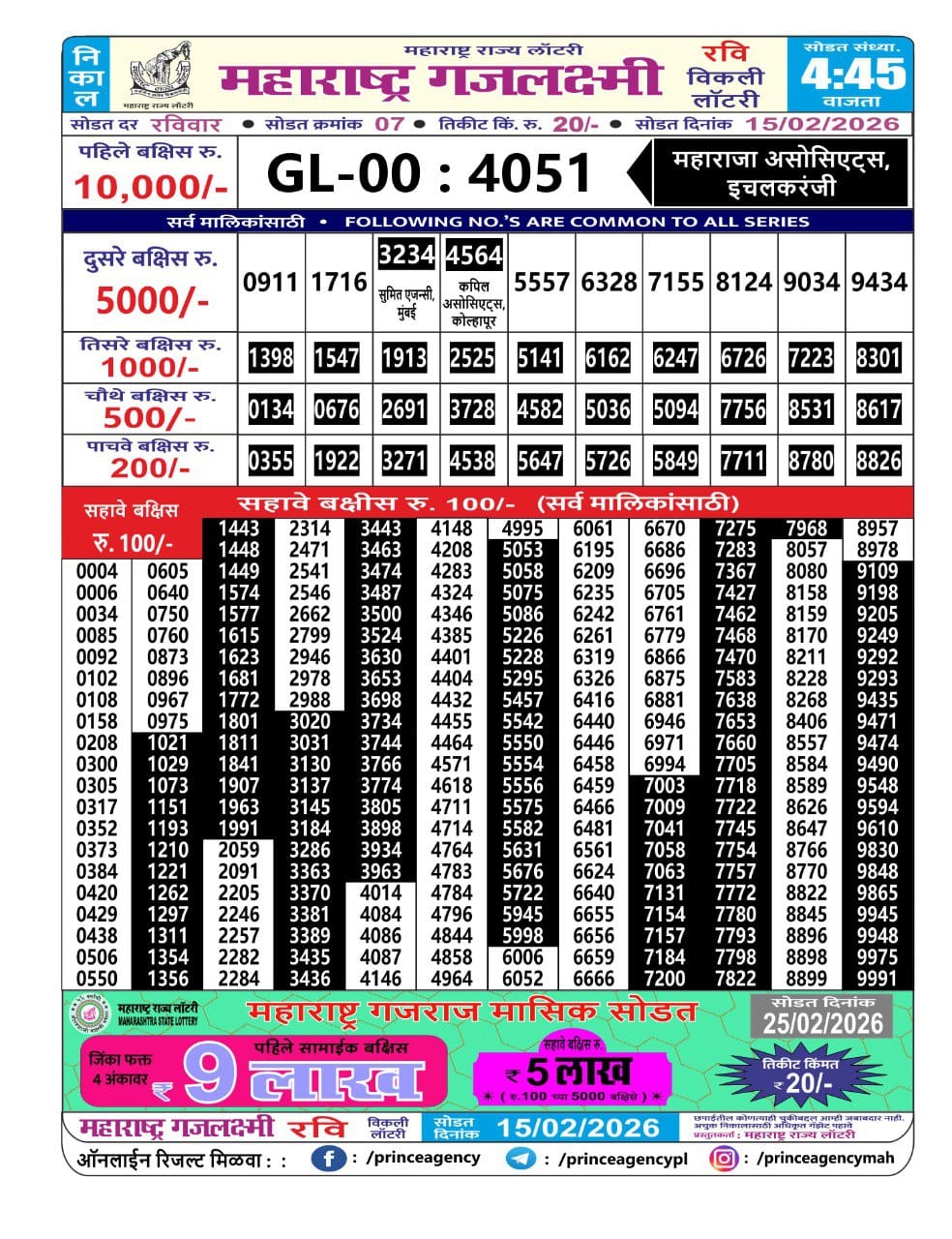 Maharashtra Gajlaxmi Ravi Weekly Draw 15.02.2026 Result 4.45 PM