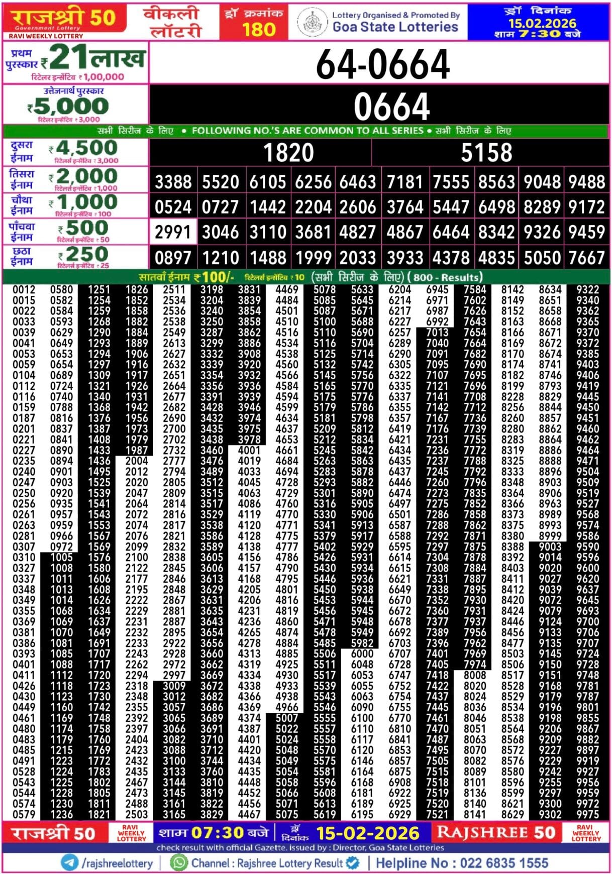 Rajshree 50 Ravi Weekly Lottery 15.02.2026 Result 7.30pm