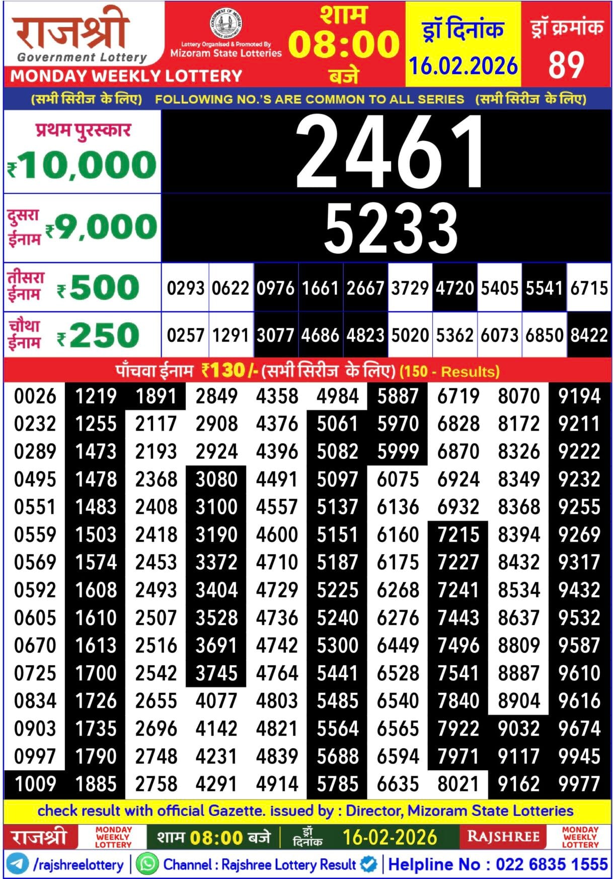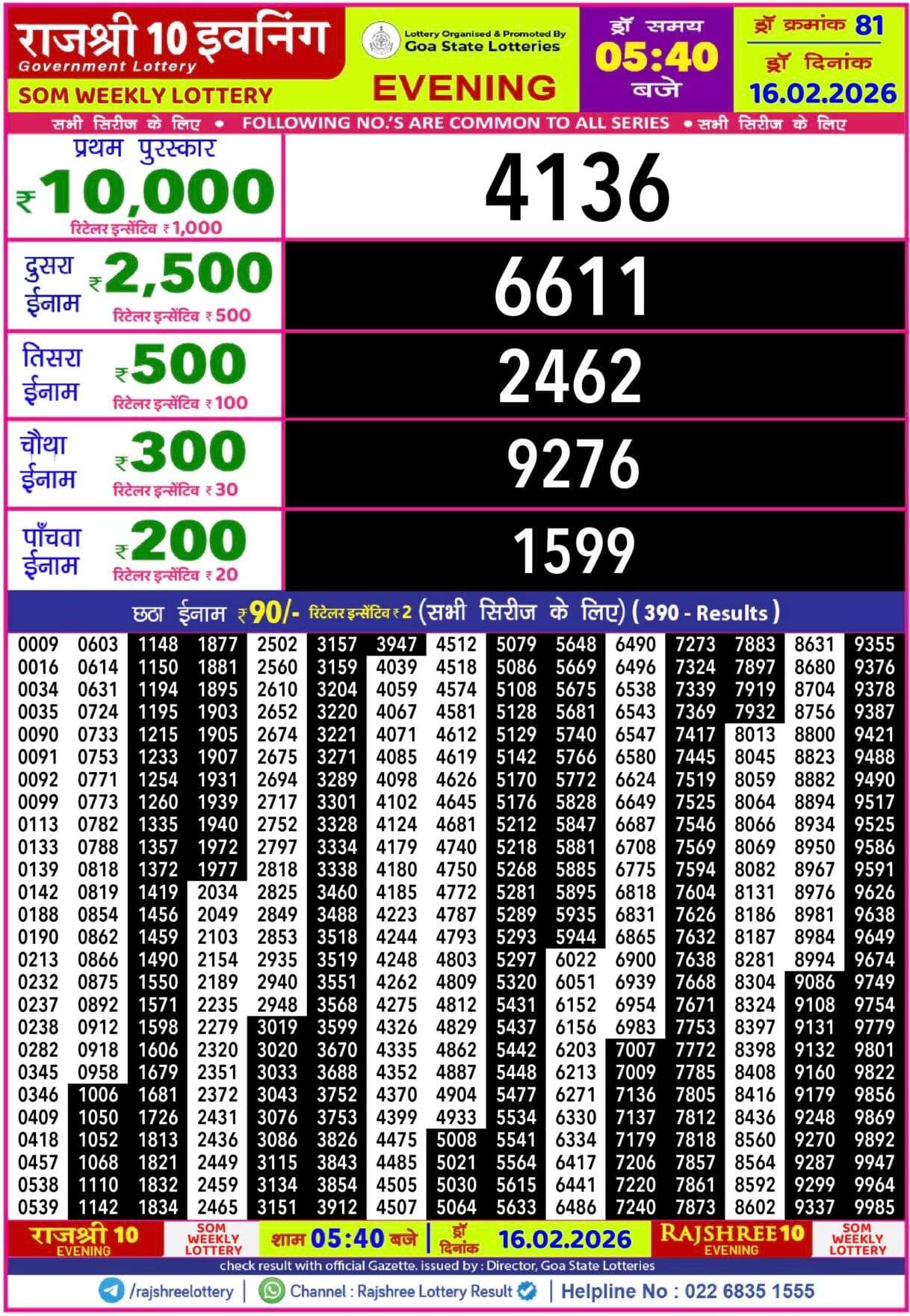 Rajshree Som Weekly Lottery 16.2.2026 Result 2.25 PM