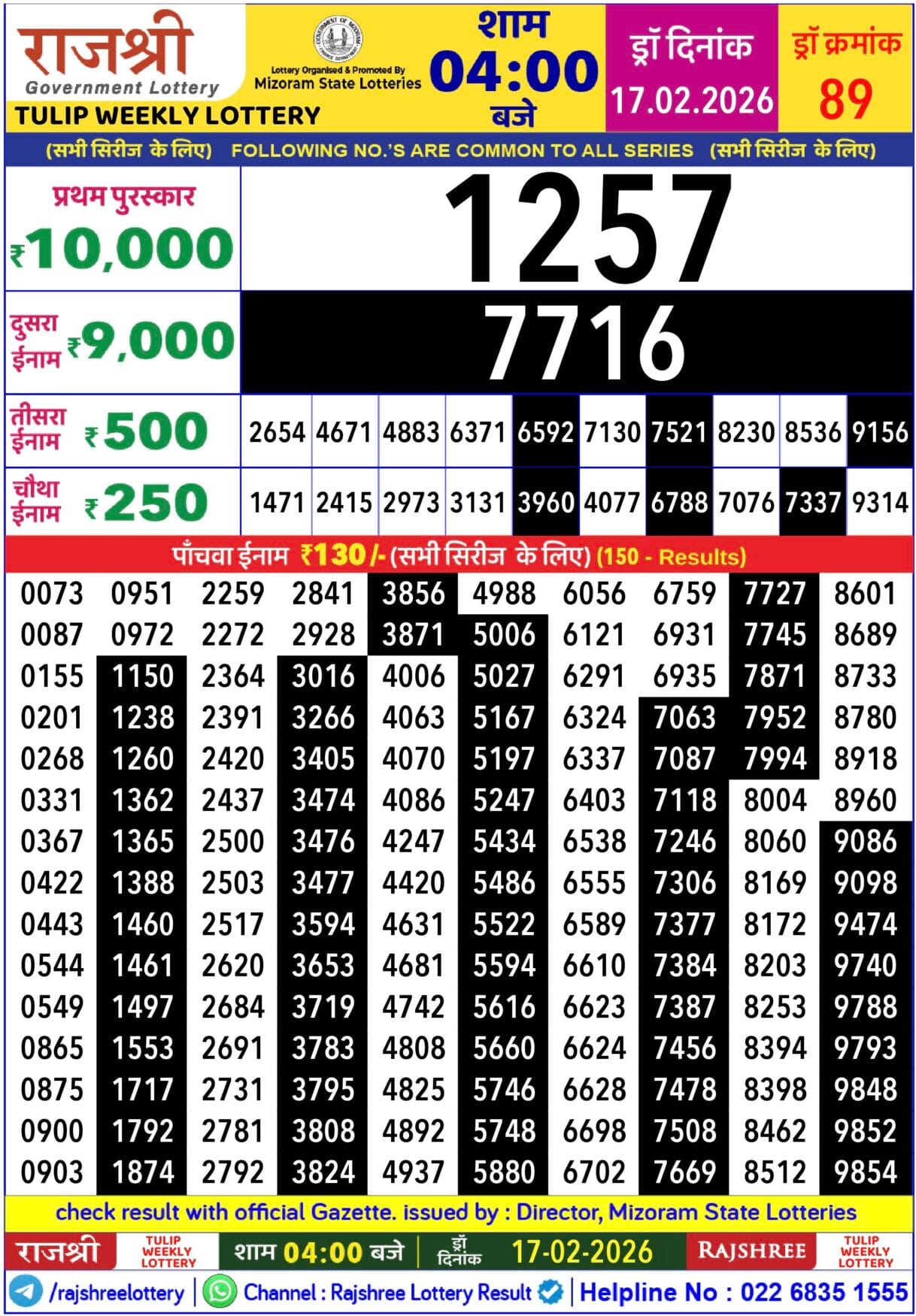 Rajshree Tulip Tuesday Weekly Lottery 17.02.2026 Result 4 PM