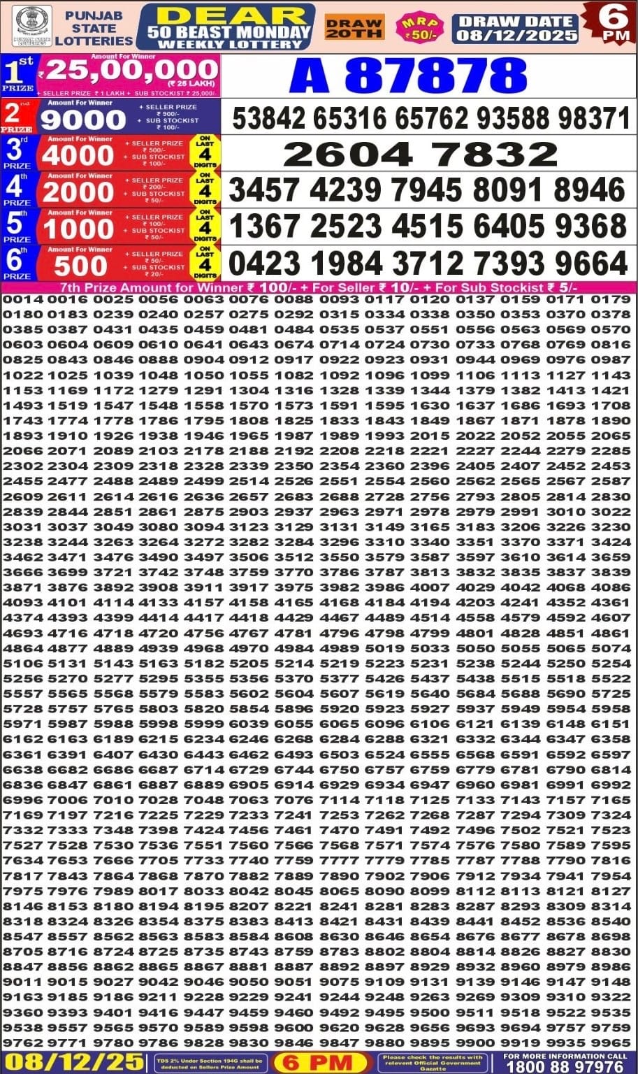 Punjab State Dear 50 Beast Monday 6pm Lottery Result 08.12.2025