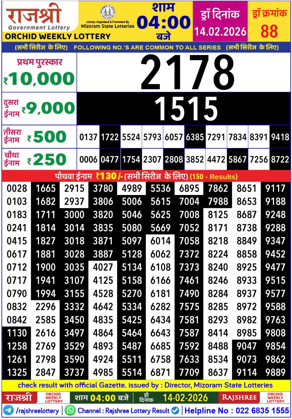 Rajshree Orchid Saturday Weekly Lottery 14.02.2026 Result 4 PM